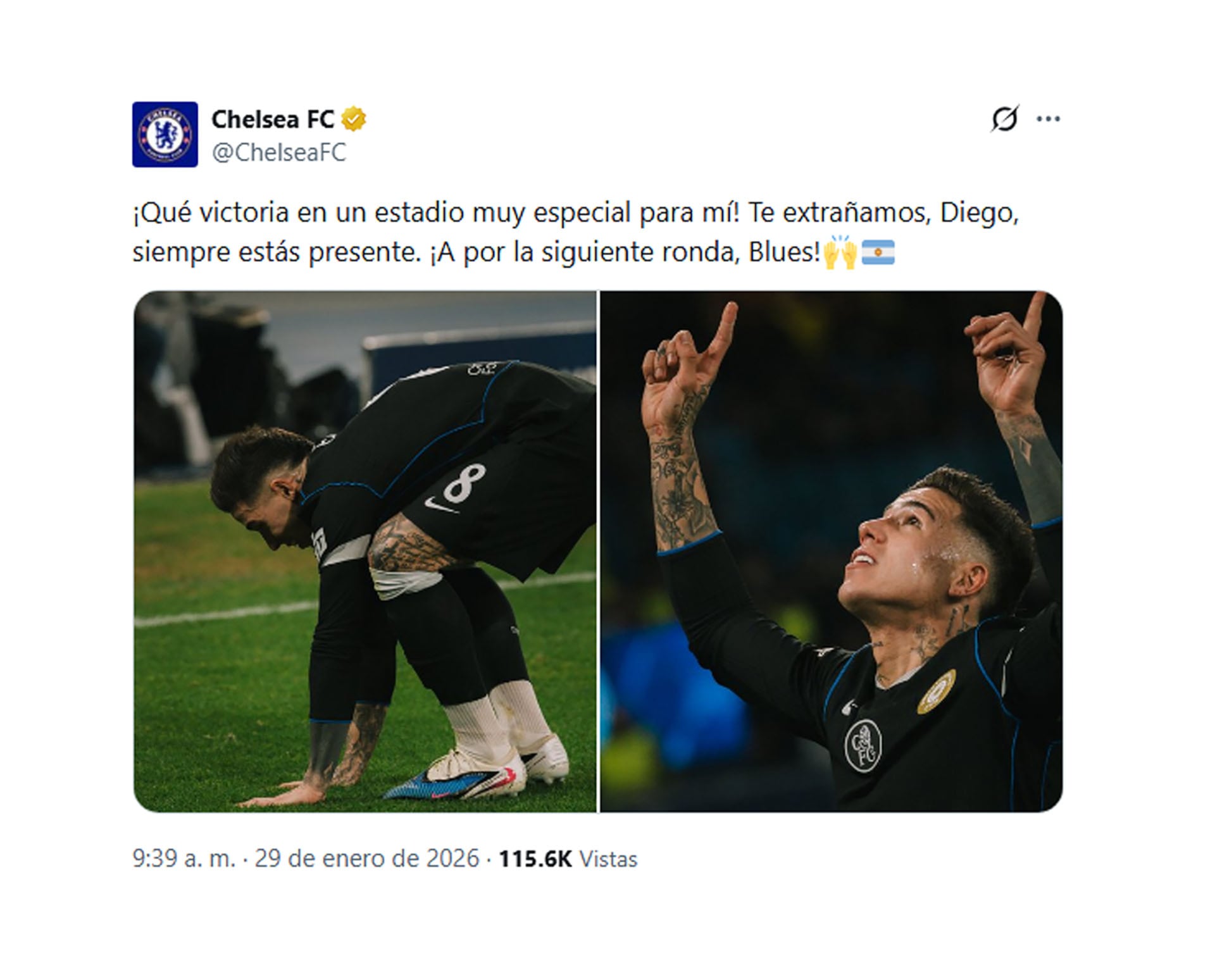 El homenaje tomó forma tras el pitazo final. En sus redes sociales, Enzo Fernández compartió un mensaje que resonó en la afición: “Qué victoria en un estadio muy especial para mí. Te extrañamos, Diego, siempre estás presente. A la próxima ronda, vamos Blues”. El posteo en Instagram fue replicado en la cuenta oficial de X del Chelsea, acompañado de una imagen en la que el volante besaba el césped y otra que señalaba al cielo, gestos asociados a la memoria de Diego Maradona.