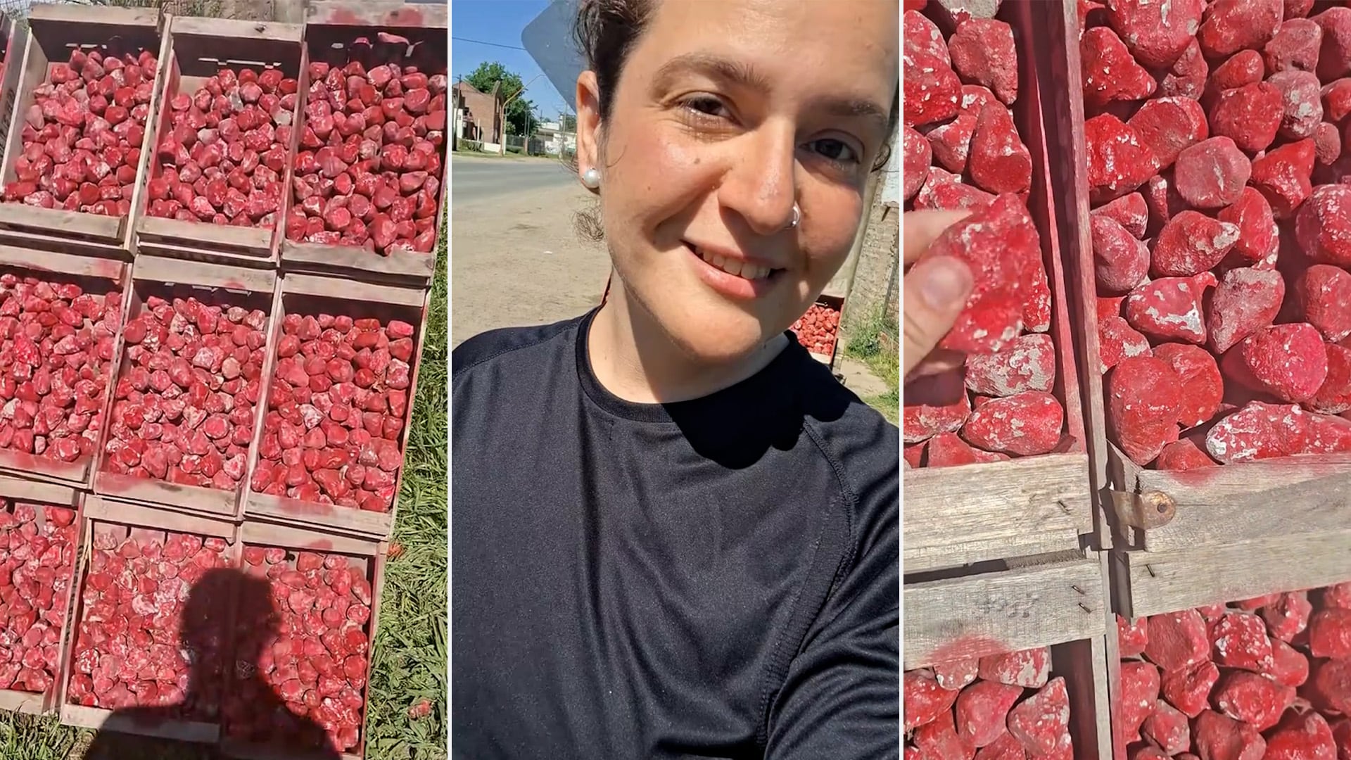 El hallazgo no tardó en sorprenderla, generando un momento que la joven decidió inmortalizar en un video. En la grabación, se la puede escuchar relatando la situación entre risas y expresando su fascinación por la escena. “Estoy en la ruta y dije ‘voy a frenar a comprar una fruta, tipo unas frutillas’, pero miren, son piedras pintadas”, revela la usuaria, aún incrédula ante lo que ve. Con la cámara registra las imitaciones, mientras señala que las piedras no solo están bien pintadas, sino que sus formas se asemejan notablemente a las auténticas frutillas. “Quiero rescatar que las formas de las piedras son como las frutillas. Están re bien hechas”, comenta, evidenciando admiración por el trabajo y la creatividad detrás de la idea.