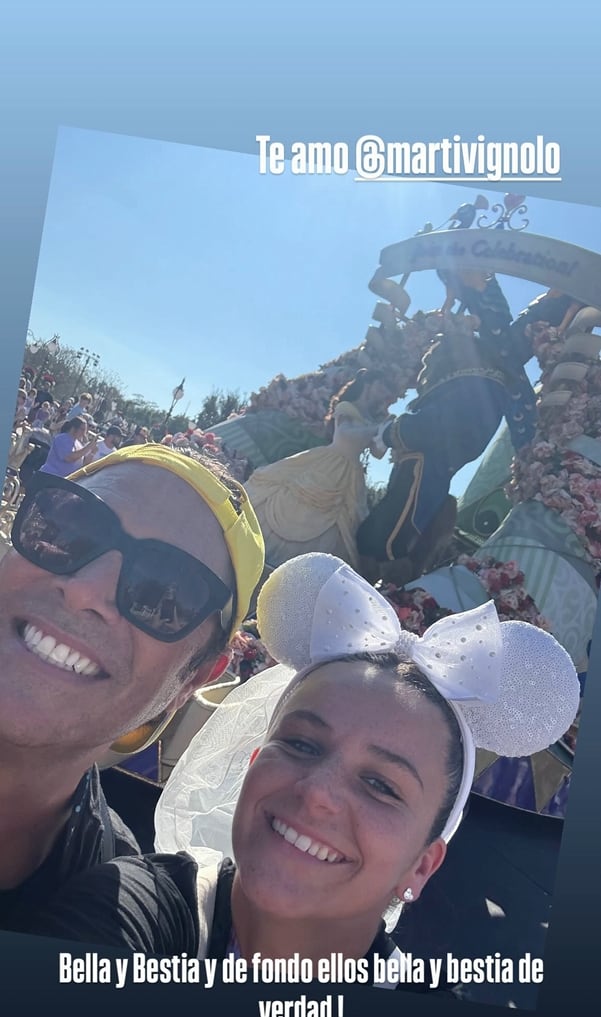 Para Martina, Disney siempre fue un deseo profundo. Aunque ya había visitado los parques en un viaje familiar, esta vez significó algo diferente: regresó con el amor de su vida, en pleno comienzo de esta nueva etapa como pareja casada. Desde el minuto uno, ambos dejaron claro en sus redes que estaban viviendo un sueño. “Llegamos, y muy muy felices”, escribió ella en una de las primera fotos del viaje, abrazada a Matías frente al icónico castillo y con orejas de Minnie con velo blanco, un accesorio típico de los “honeymooners” del parque.