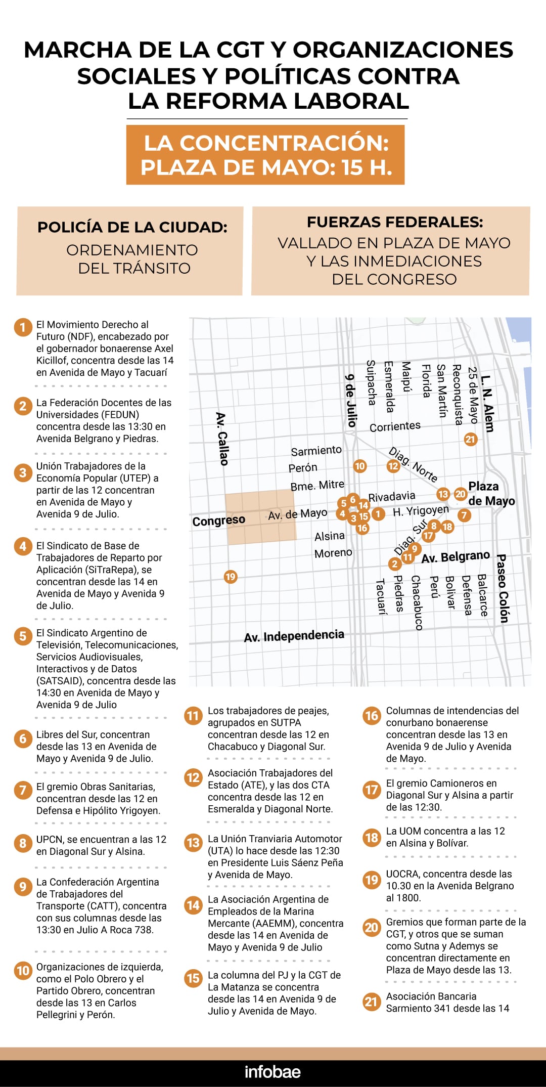 La Federación Docentes de las Universidades (FEDUN) concentrará desde las 13.30 en Avenida Belgrano y Piedras, mientras que la UOCRA lo hará desde las 10.30 en Avenida Belgrano al 1800. En Avenida de Mayo y Avenida 9 de Julio, uno de los principales puntos de concentración, se reunirán la Unión de Trabajadores de la Economía Popular (UTEP) desde las 12, el Sindicato de Base de Trabajadores de Reparto por Aplicación (SiTraRepa) desde las 14, el SATSAID desde las 14.30, Libres del Sur desde las 13, la Asociación Argentina de Empleados de la Marina Mercante (AAEMM) desde las 14, la columna del PJ y la CGT de La Matanza desde las 14, y las columnas de intendencias del conurbano bonaerense desde las 13.