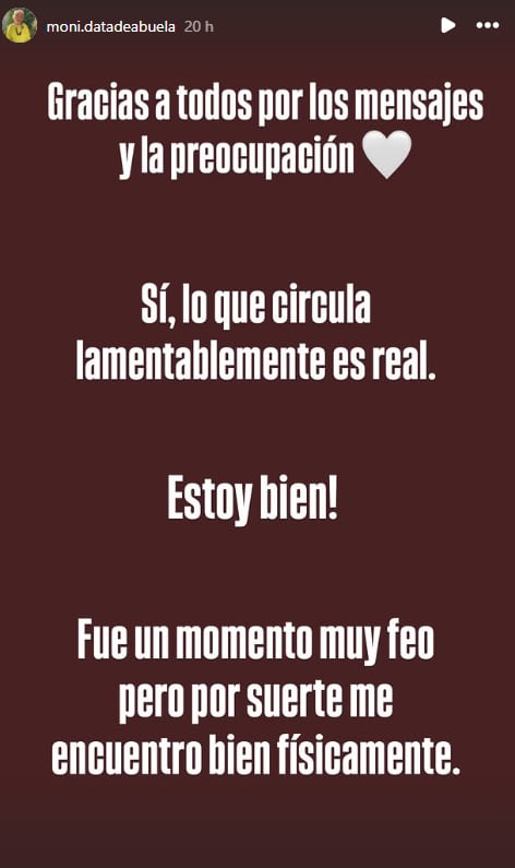 “Gracias a todos por los mensajes y la preocupación. Sí, lo que circula lamentablemente es rea. Estoy bien! Fue un momento muy feo, pero por suerte me encuentro bien físicamente”, dice la primera publicación que hizo.