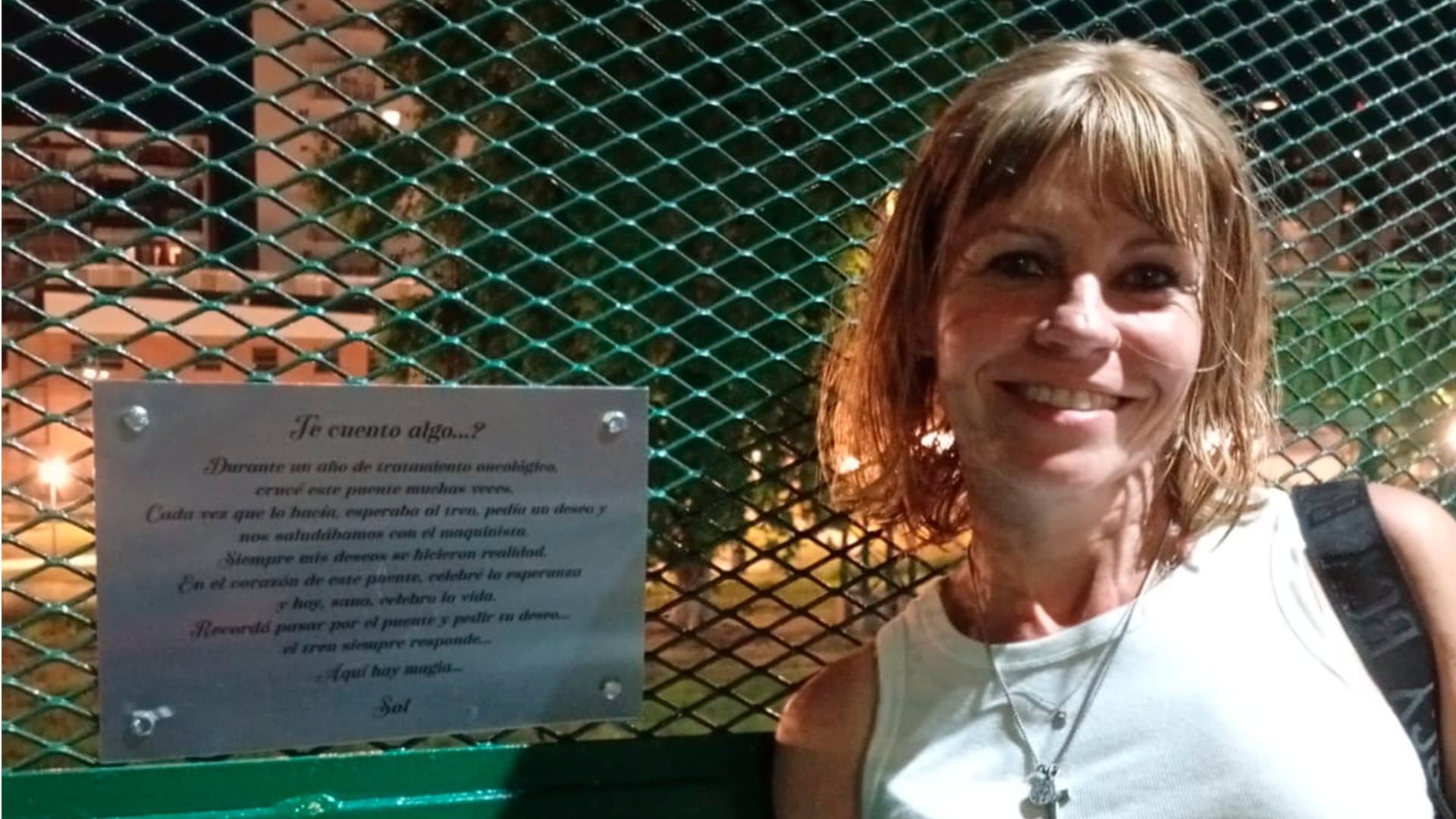 Sol tiene 44 años y vive en Gaiman, Chubut. Dejó una placa con su mensaje esperanzador en el puente que cruzó tantas veces durante sus tratamientos