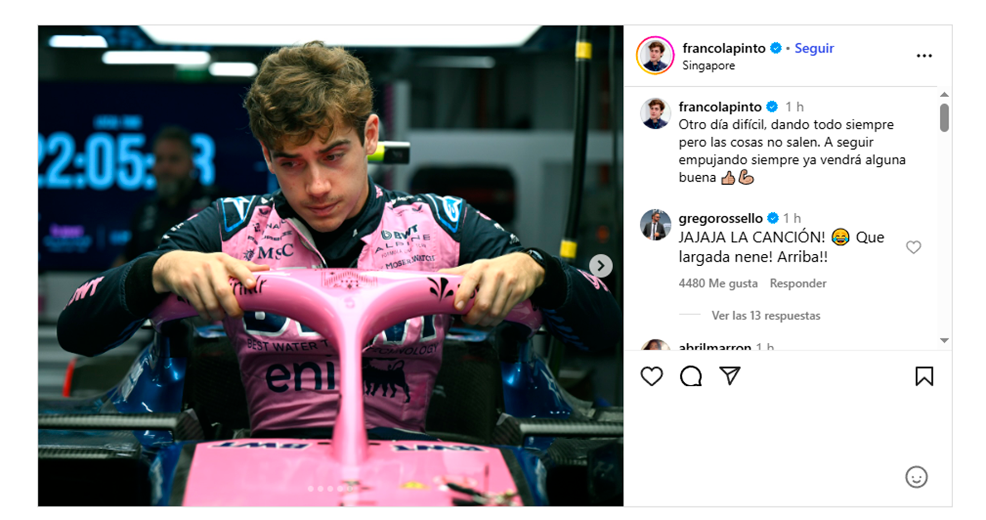 Luego de la competencia, el piloto bonaerense, de 22 años, compartió en su cuenta de Instagram un mensaje dirigido a sus seguidores en el que expresó: “Otro día difícil, dando todo siempre, pero las cosas no salen. A seguir empujando siempre, ya vendrá alguna buena”.