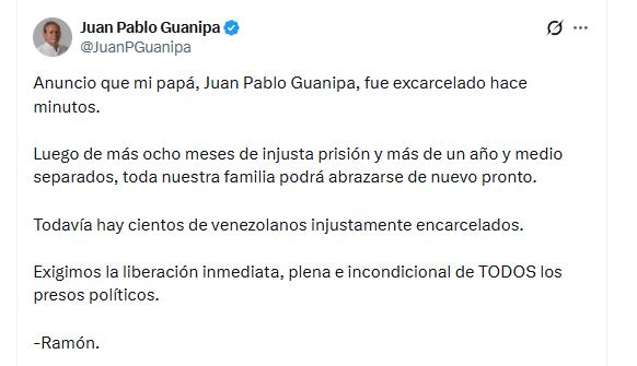 La noticia de la excarcelación también fue confirmada por su hijo, Ramón Guanipa.