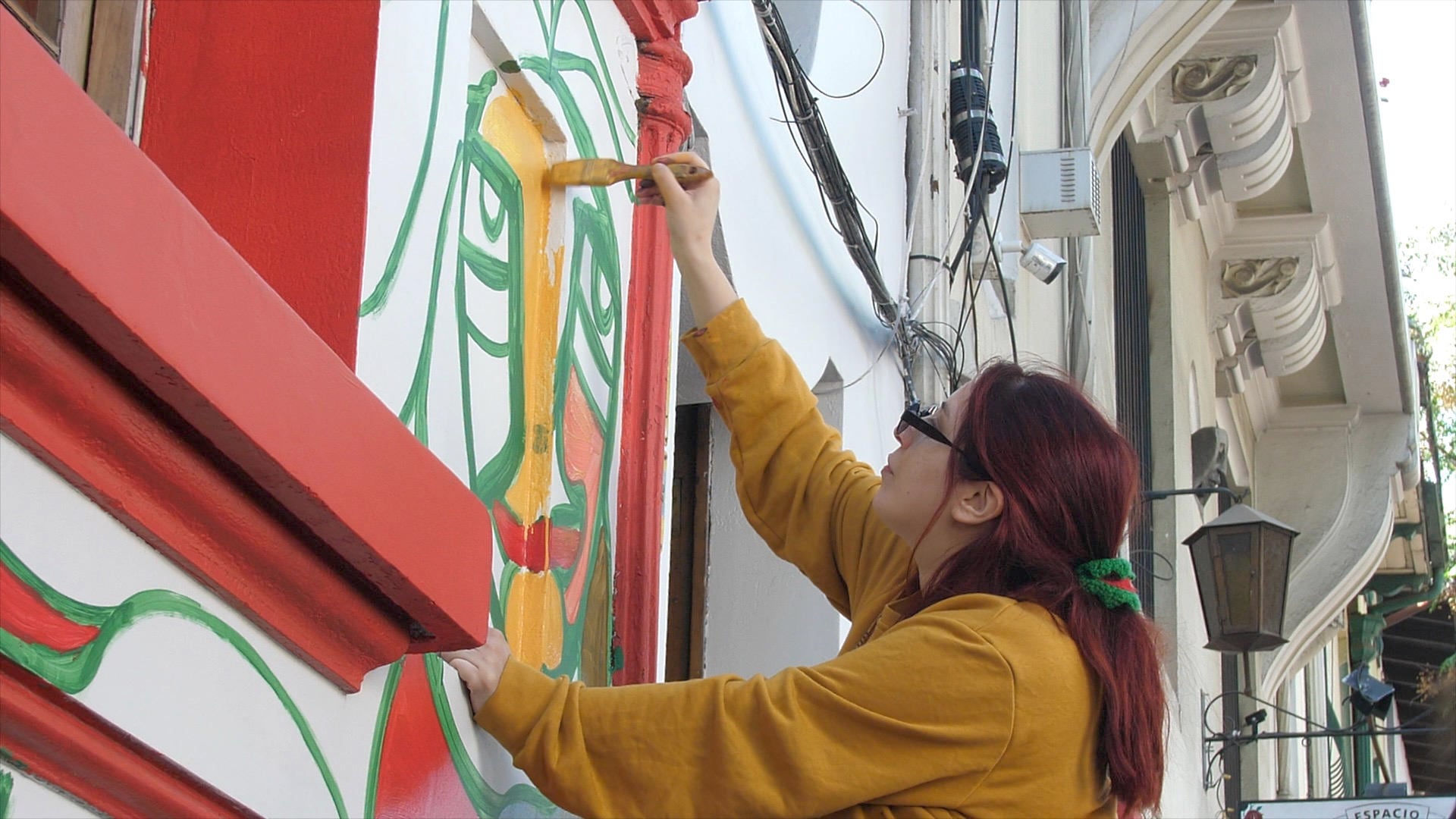 Con unos sencillos trazos verdes, los brigadistas bocetan el mural con sus característicos rostros abstractos y banderas chilenas que mutan en palomas, ojos o guitarras.
