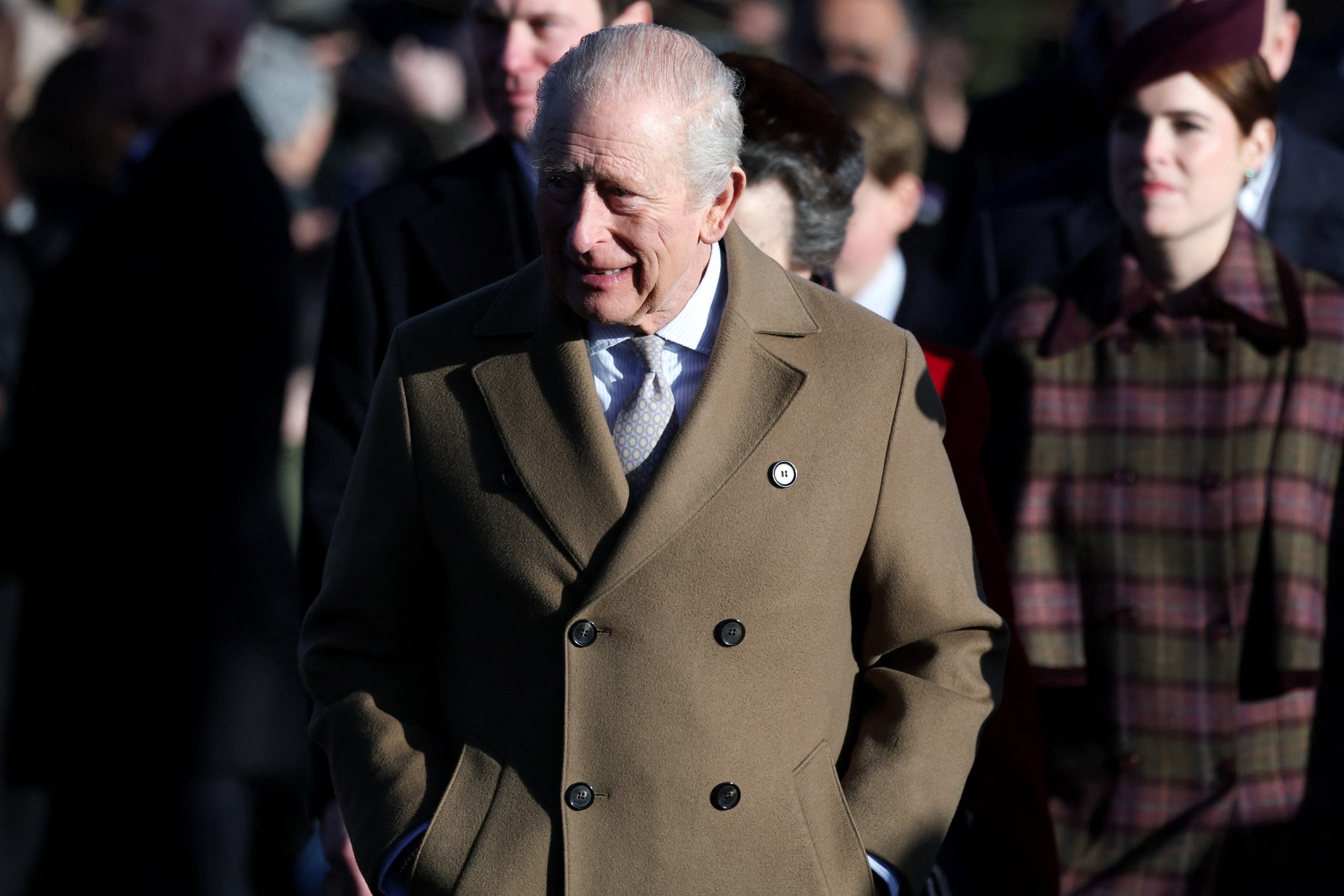 El rey Carlos de Gran Bretaña, junto con miembros de la familia real, llega para asistir al servicio del día de Navidad de la Familia Real en la iglesia de Santa María Magdalena, mientras la realeza se instala en la finca de Sandringham en el este de Inglaterra, Gran Bretaña, el 25 de diciembre de 2025. REUTERS/Hannah McKay