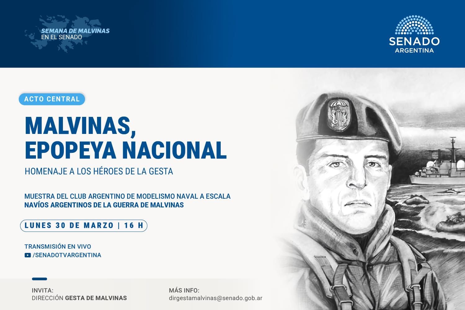 El lunes 30 de marzo a las 16, el mismo Salón Azul continuó siendo sede con la ceremonia “Malvinas, epopeya nacional”. Este acto busca renovar el homenaje a los caídos y a los veteranos, y se instala como el punto de mayor visibilidad institucional en la agenda propuesta por la Dirección Gesta de Malvinas.