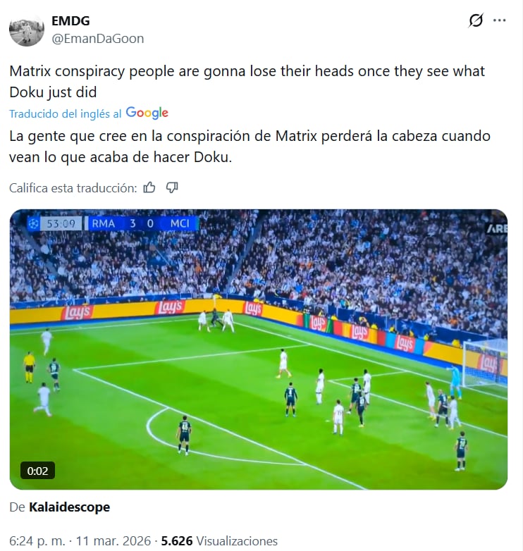 “Doku desaparece por una fracción de segundo. Los aficionados del City me dijeron que tenía algunos trucos bajo la manga, pero esto es una locura”, escribió el usuario @TrollFootball2. “La gente que cree en la conspiración de Matrix perderá la cabeza cuando vean lo que acaba de hacer Doku”, añadió la cuenta @EmanDaGoon.
