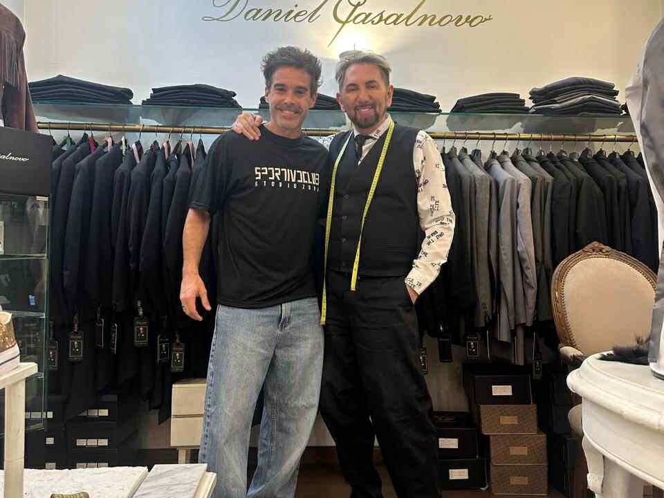 La relación entre ambos quedó plasmada en imágenes. Cuando llegó el momento de retirar el traje, Cabré posó sonriente, abrazado a su diseñador con un fondo de percheros infinitos y la firma de Daniel coronando la escena. Compartió la foto en su cuenta de Instagram, con la leyenda: “Ya con el traje del casamiento. Gracias por todo”, mientras sostenía la funda blanca con la inscripción del atelier que contenía el secreto mejor guardado de su boda.