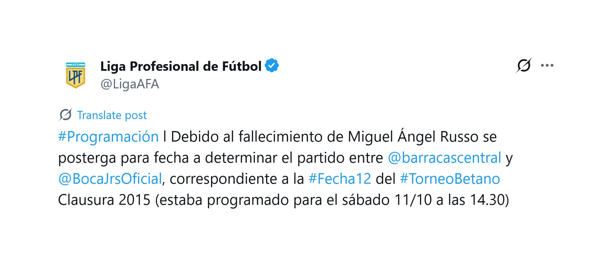 Debido al fallecimiento de Miguel Ángel Russo se posterga para fecha a determinar el partido entre Barracas Central y Boca Juniors, correspondiente a la fecha 12 del Torneo Clausura 2025 (estaba programado para el sábado 11/10 a las 14.30)