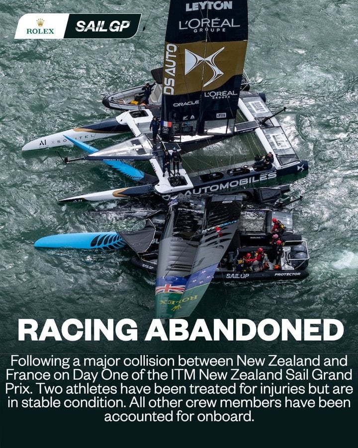 “La regata se suspendió tras una importante colisión entre Nueva Zelanda y Francia en el primer día del Gran Premio de Vela ITM de Nueva Zelanda. Próximamente habrá más información”, informaron desde la organización en los primeros minutos de este sábado en referencia al segundo de los 13 eventos del calendario.