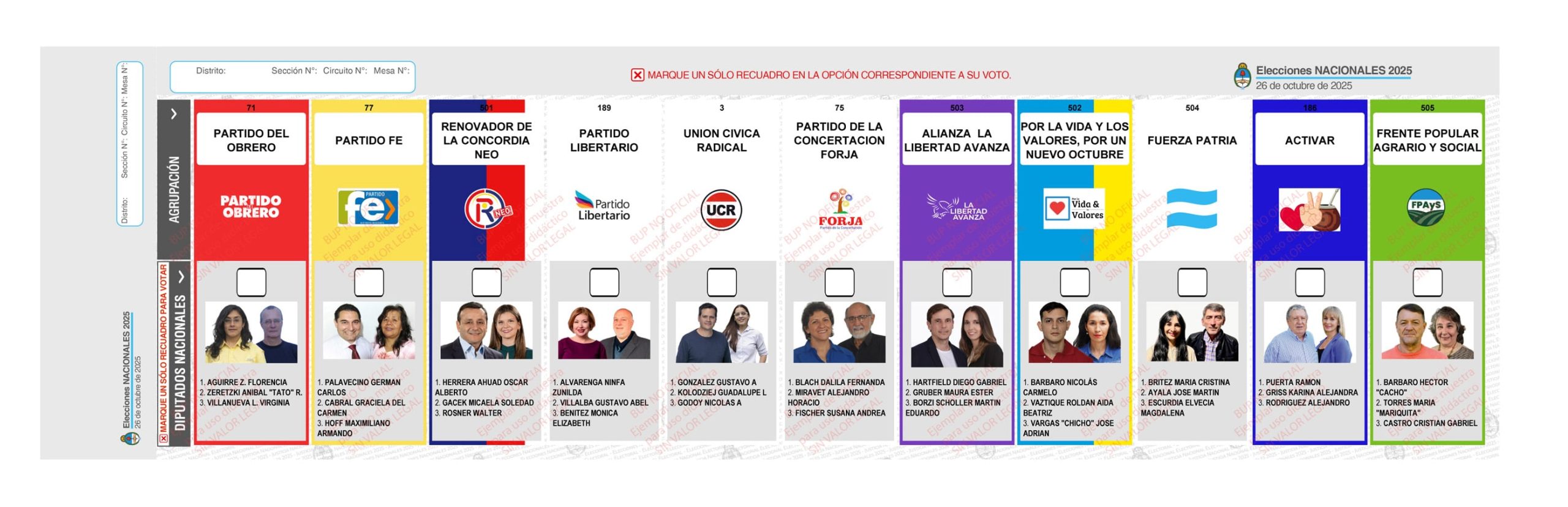 3. Está autorizado realizar una sola marca por cada categoría, como diputado o senador si corresponde. El diseño de la boleta distribuye las alternativas partidarias y sus candidaturas en columnas, mientras que las categorías a elegir aparecen dispuestas en filas, lo que permite comparar de manera simultánea todas las opciones disponibles.