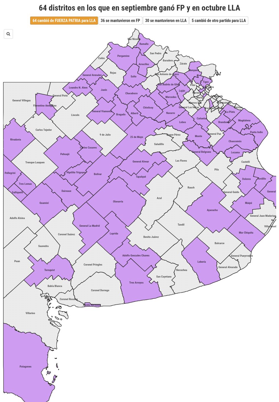 De los 64 partidos bonaerenses donde Fuerza Patria había ganado en las provinciales y el domingo ganó LLA, la lista violeta se había consolidado como segunda fuerza en 51 de ellos, y como tercera en 13 municipios, detrás de Somos (excepto en el caso de Suipacha, donde la segunda fuerza fue Potencia). Esto significa que pasó de ser la tercera fuerza a ser la primera en solo 50 días.