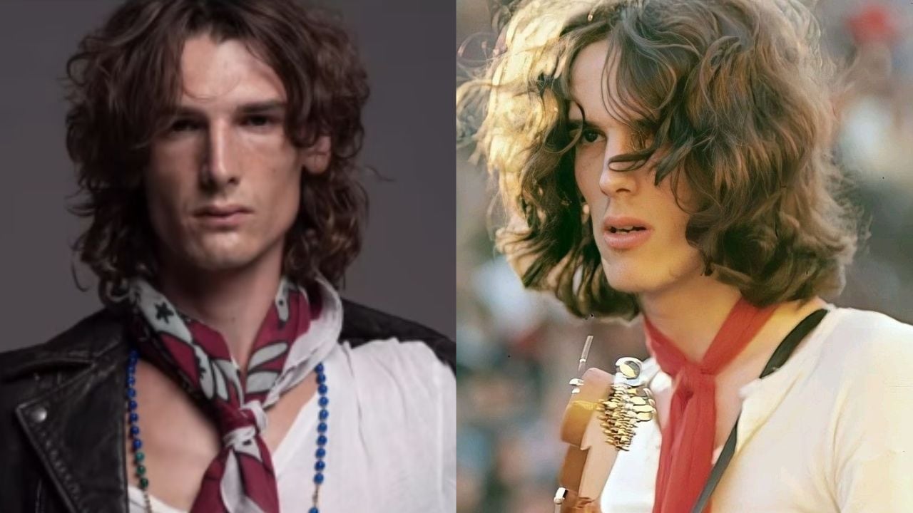 Cada imagen revela detalles que recuerdan la estética de Spinetta en los años 70, desde el cabello hasta la expresión seria y bohemia (Crédito: Instagram/gabriel_rocca)