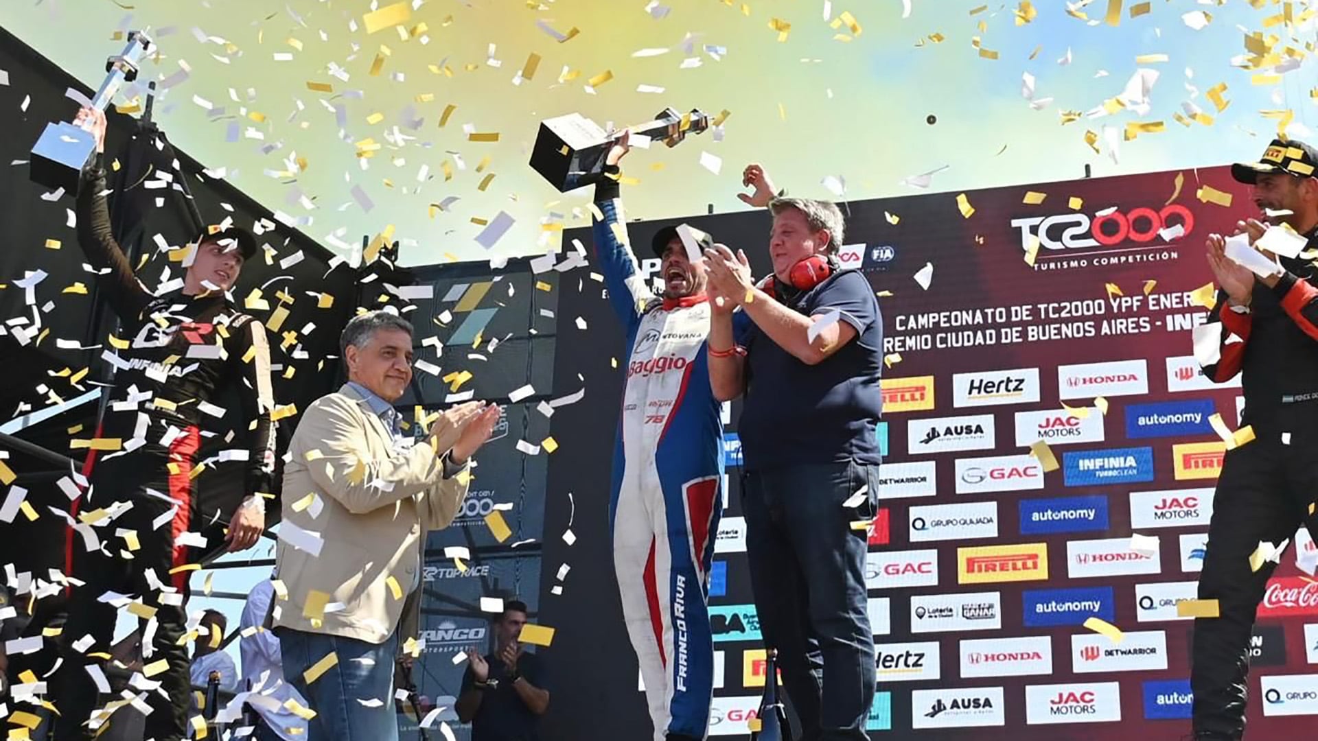 La jornada comenzó con las categorías teloneras: en Fiat Competizione se impuso Matías Apuzzo, y en Top Race el triunfo fue para Marcelo Ciarrocchi. El clímax llegó al mediodía, con el himno nacional en los parlantes y el cielo surcado por aviones que dibujaron estelas blancas, para la largada del TC2000.