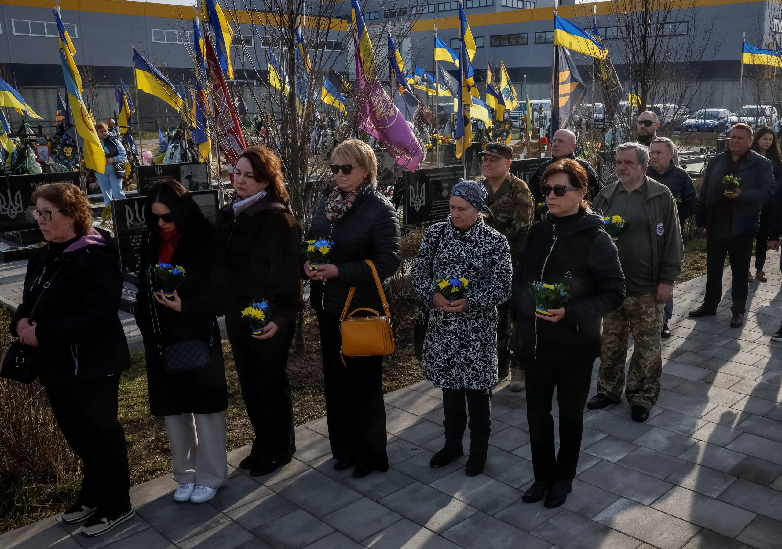 Personas visitan las tumbas de sus familiares, defensores ucranianos caídos en combate, conmemorando el cuarto aniversario de la liberación de la ciudad de Bucha, en medio del ataque ruso contra Ucrania, en Bucha, a las afueras de Kiev, Ucrania, el 30 de marzo de 2026. REUTERS/Gleb Garanich