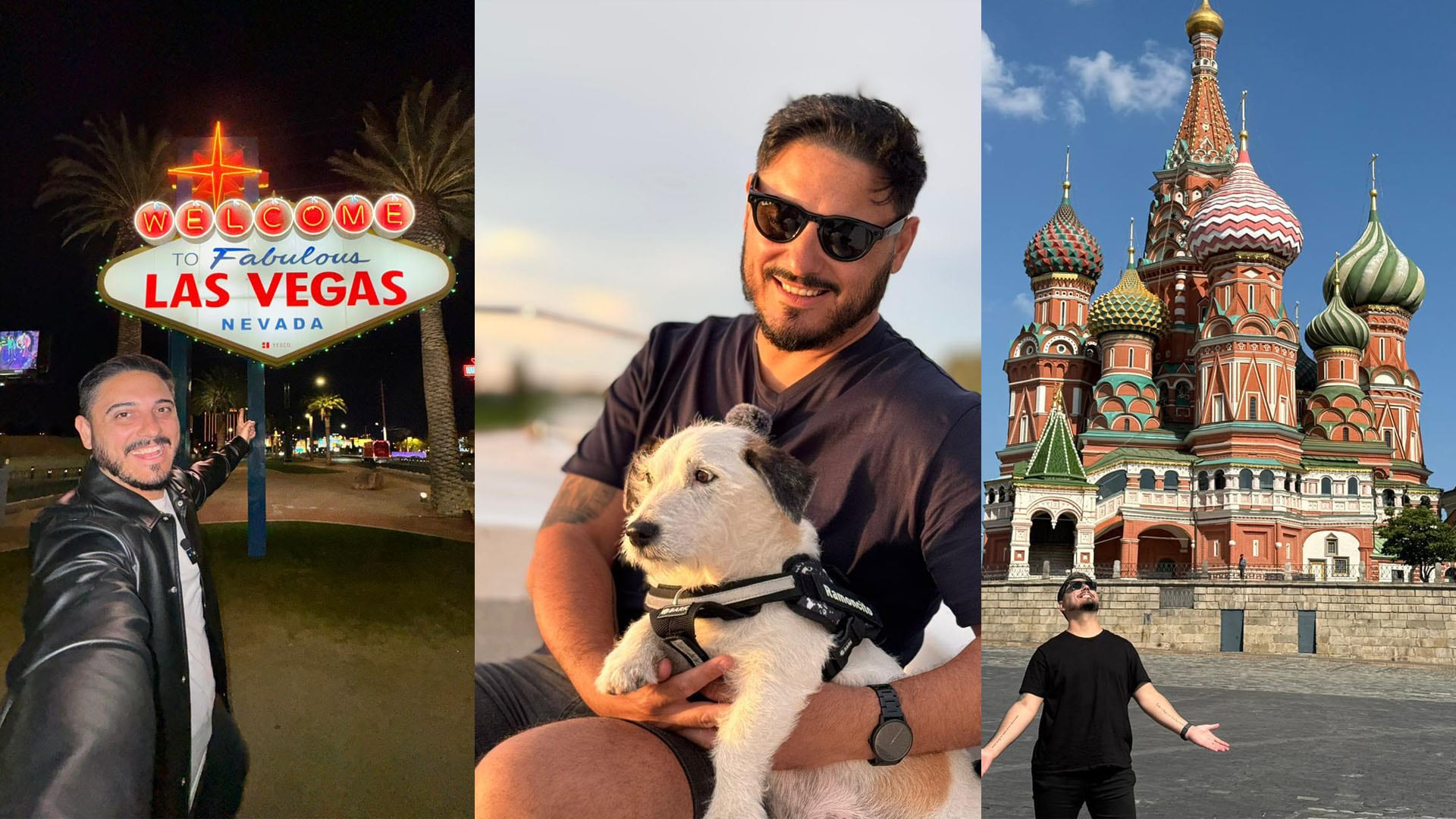 Un hombre y su perro compañero posan en tres destinos turísticos emblemáticos, incluyendo Las Vegas y la Catedral de San Basilio en Moscú, mostrando la alegría de viajar juntos.