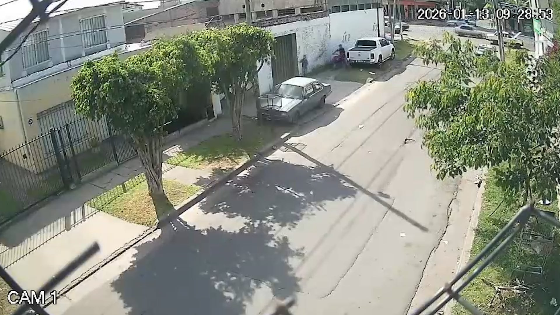 Gustavo cayó tendido en la vereda, mientras que los asaltantes tomaron su moto y comenzaron la huida a pie. En la grabación de una cámara de vigilancia se observa que a uno de los atacantes se le complicó arrancar el rodado más de la cuenta. Incluso, en medio de una de sus maniobras por darle marcha, puso la moto en forma de Willy y estuvo cerca de caer de espaldas junto a su cómplice.