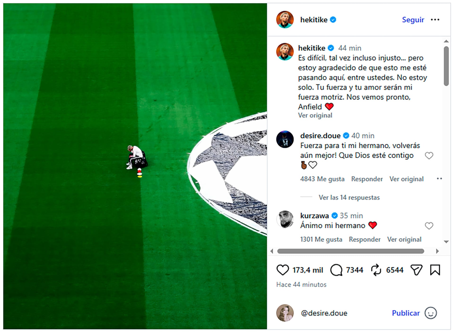 En redes sociales, varios compañeros de la selección francesa de fútbol, entre ellos el capitán Kylian Mbappé, manifestaron su respaldo a Ekitike tras conocerse la gravedad de la lesión. Incluso el propio jugador publicó unas sentidas palabras en su cuenta de Instagram. «Es difícil, quizás incluso injusto… pero estoy agradecido de que esto me esté pasando aquí, entre ustedes. No estoy solo. Su fuerza y su amor serán mi motor», escribió junto a una imagen en la que aparece sentado solo en el campo.