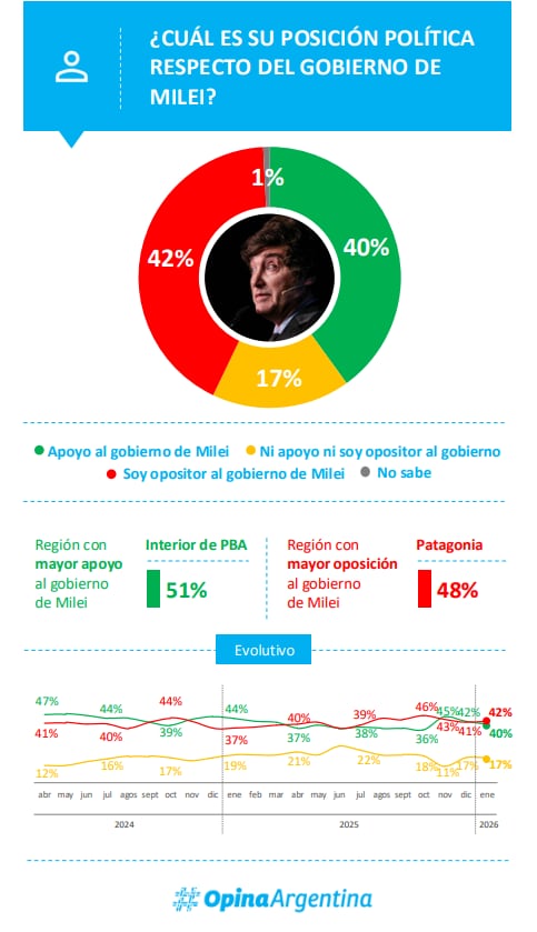 El estudio realizado por Opina Argentina abarcó a 3.590 habitantes de Argentina y reporta un margen de error de ±1,7 % con un nivel de confianza del 95 %. Según la publicación, revelaron que la popularidad presidencial se sostiene por tercer año consecutivo, en un escenario atravesado por opiniones divididas respecto al contexto social y político.