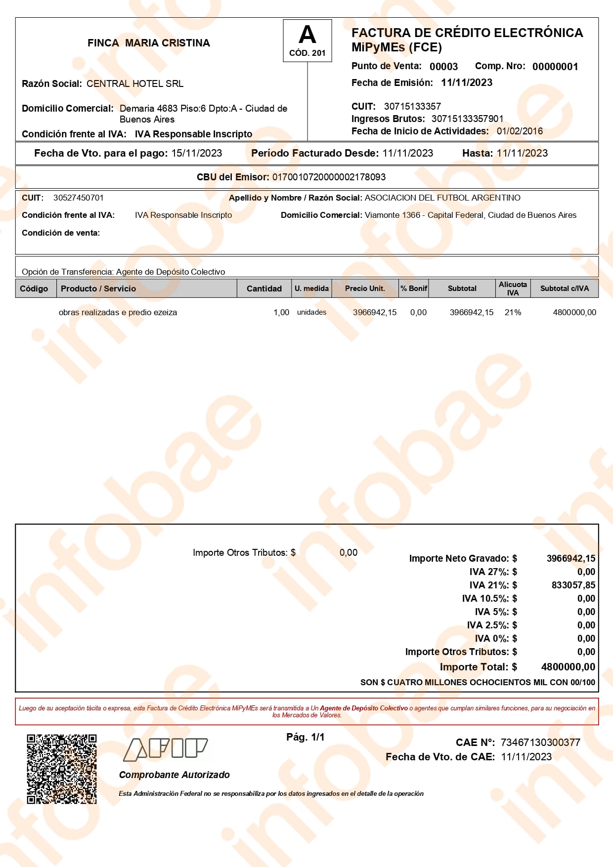 Otro de los casos es el de Central Hotel S.R.L. – Finca María Cristina. La documentación muestra dos facturas emitidas en noviembre y diciembre de 2023, ambas como FCE, por 4,8 millones de pesos cada una, con idéntico concepto: “obras realizadas en predio Ezeiza”.