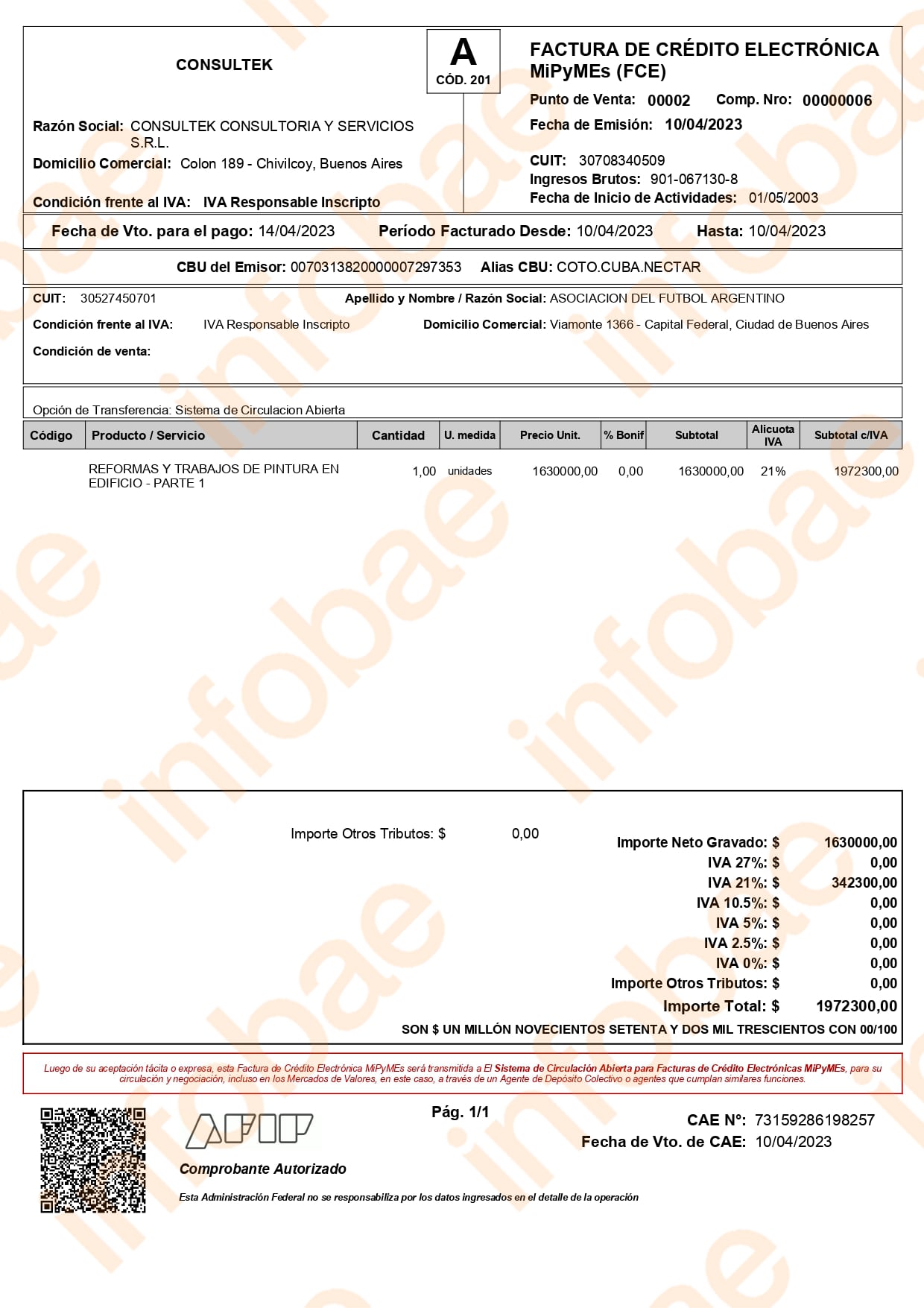 De acuerdo con la documentación a la que accedió Infobae de fuentes con acceso a la causa, los comprobantes incorporados a la presentación judicial permiten reconstruir cómo se instrumentaron las operaciones en la práctica, con fechas, conceptos y montos precisos, todas ellas emitidas durante el período en que Tapia ejerce la presidencia de la AFA.
