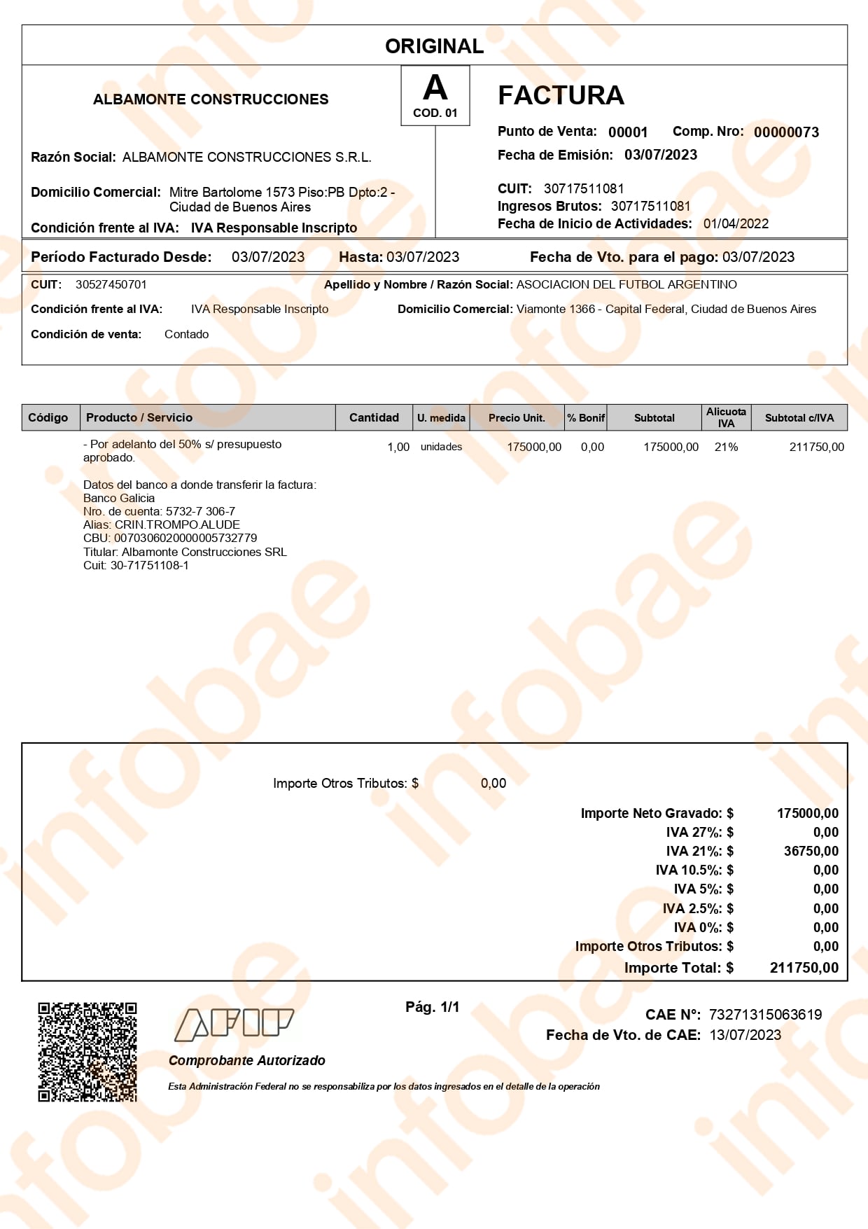 Las facturas de Albamonte Construcciones S.R.L. corresponden a dos comprobantes tipo A, fechados en julio y agosto de 2023. Los conceptos consignados son “adelanto 50% de presupuesto aprobado” y “saldo restante 50%”.