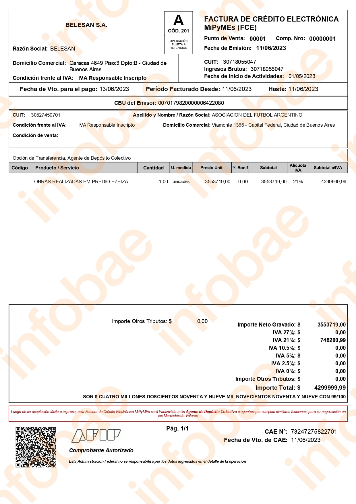 En el caso de Belesan S.A., la denuncia incorpora una factura emitida el 11 de junio de 2023, bajo la modalidad de FCE, por un monto de 4.299.999,99 pesos, con el concepto “obras realizadas en predio Ezeiza”.