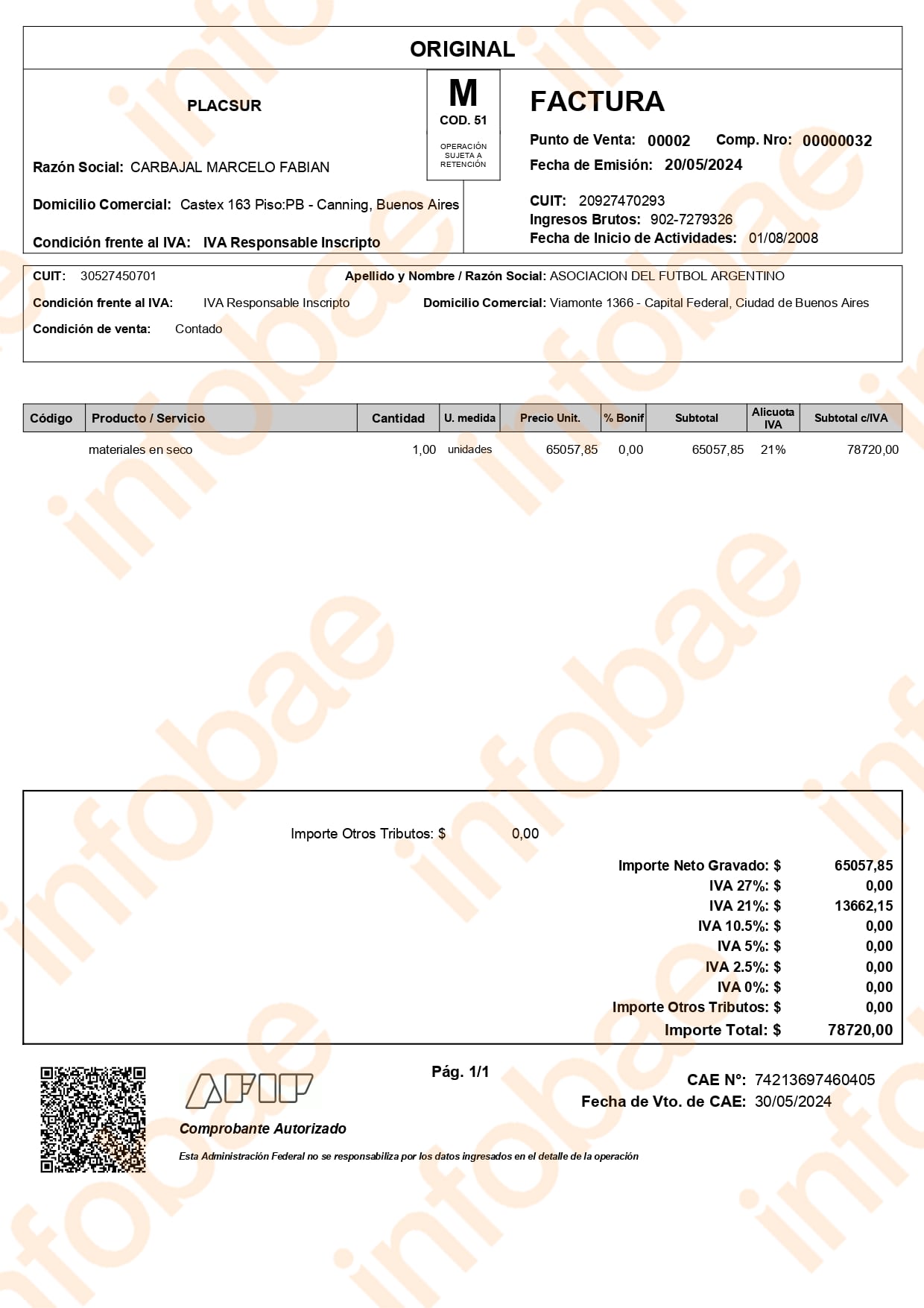 La denuncia también incorpora comprobantes de proveedores de menor envergadura, como PLACSUR, con una Factura M por 78.720 pesos correspondiente a “materiales en seco”. Aunque los montos son marginales, ARCA observa que la lógica documental es la misma y que el destinatario de los pagos es siempre la AFA.