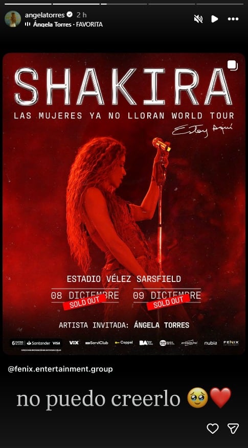 A la confirmación del anuncio, Ángela sumó en redes sociales una imagen promocional de la gira —con Shakira en primer plano y el detalle de las fechas agotadas— y el mensaje: “No puedo creerlo”, junto a emojis que reflejan alegría y asombro. El flyer oficial destaca a Ángela Torres como “artista invitada”, un reconocimiento que confirma que el 8, 9 y 11 de diciembre serán fechas marcadas a fuego en la carrera de la cantante argentina.
