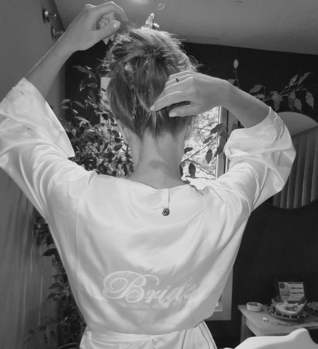 El álbum mostró instantes de trayecto, como Rocío viajando en auto hacia la siguiente parada: cabello suelto, vincha dorada y top blanco con lazo negro, en una escena distendida y natural que marcó la transición entre un destino y otro de la celebración. Ya afuera, los clásicos rituales de toda despedida de soltera: siete mujeres sentadas al borde de la piscina, todas con batas claras alzando copas y manos en alto, y Rocío, claramente identificada en el centro con la inscripción “Bride” en la espalda. El entorno —área verde, atardecer de cielo parcialmente cubierto y reposeras— amplificó el clima relajado y veraniego.