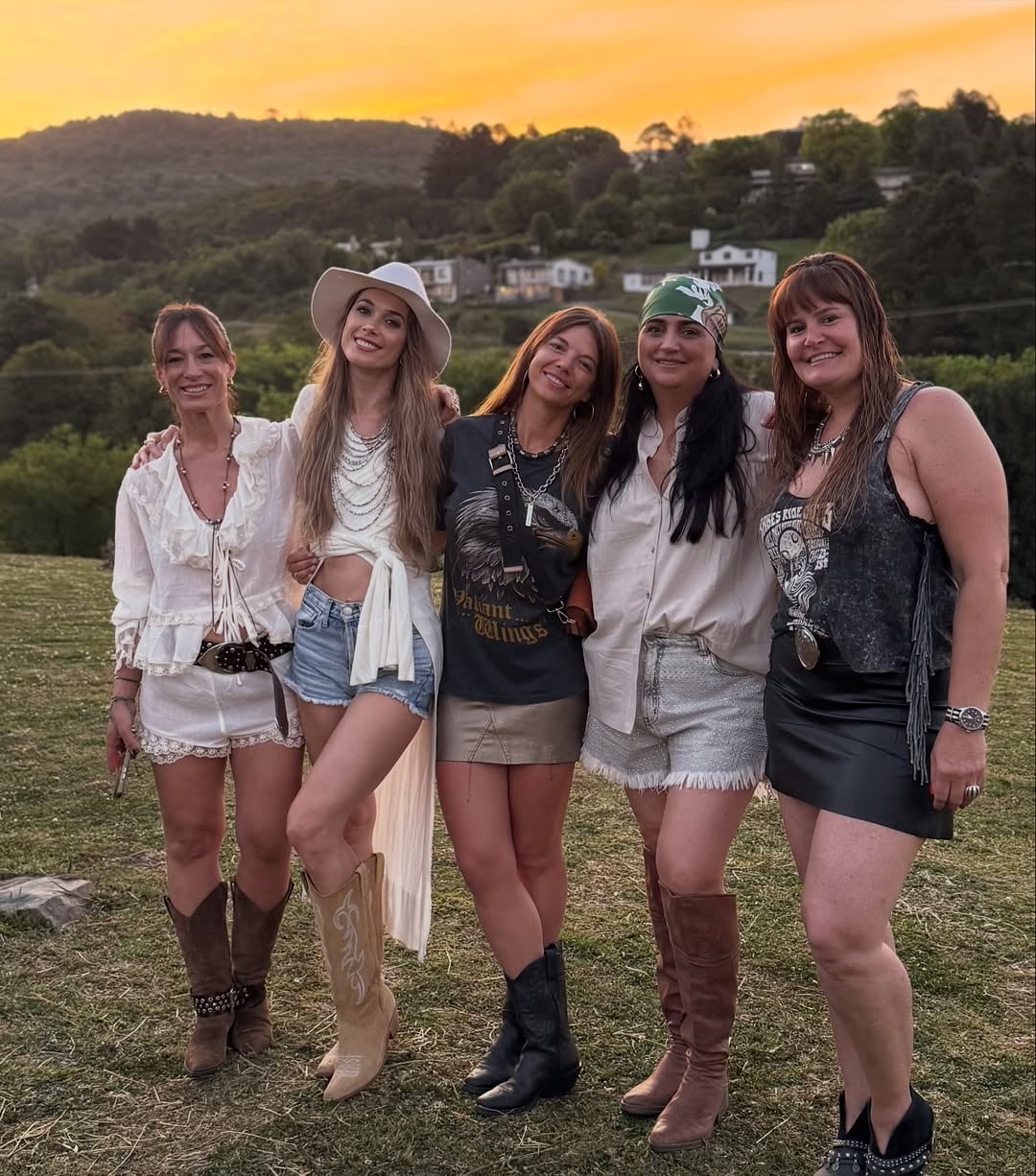 En la primera postal, Chechu posó junto a cuatro amigas sobre el césped y bajo un atardecer anaranjado, todas con looks donde predominan los sombreros, las botas tejanas y los accesorios country chic, enmarcadas por colinas onduladas y casas perdidas en el horizonte. Ella, de perfil y sonriente, se destacó con sombrero beige, camiseta blanca anudada, un maxicollar de cuentas metálicas, shorts de jeans y pulseras plateadas, exhibiendo confianza y renovada alegría ante el paisaje.