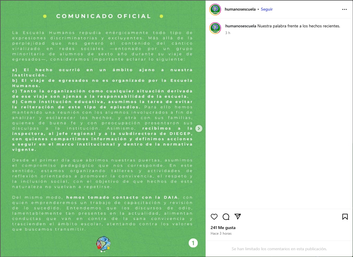 Según el descargo, el acontecimiento se produjo en un “ámbito ajeno a nuestra institución” y remarcaron que “el viaje de egresados no es organizado por la Escuela Humanos”. Además, sostuvieron que “tanto la organización como cualquier situación derivada de ese viaje son ajenas a la responsabilidad de la escuela”.