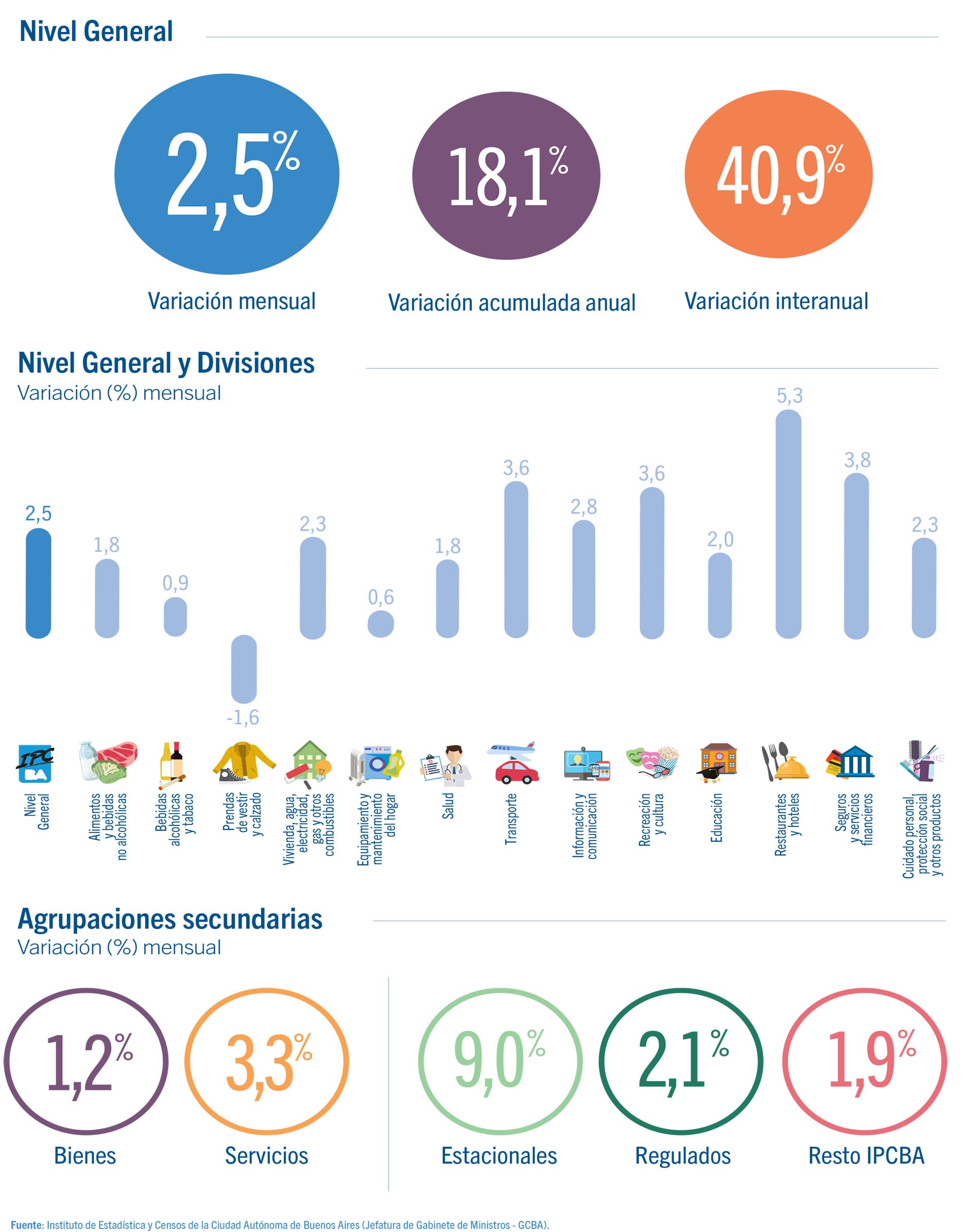 El resto de las divisiones presentó también incidencia positiva, aunque moderada, sobre el nivel general de precios. La excepción fue la división Prendas de vestir y calzado, que expresó una variación negativa de 1,6%, lo que retiró presión sobre el IPCBA general para el mes.