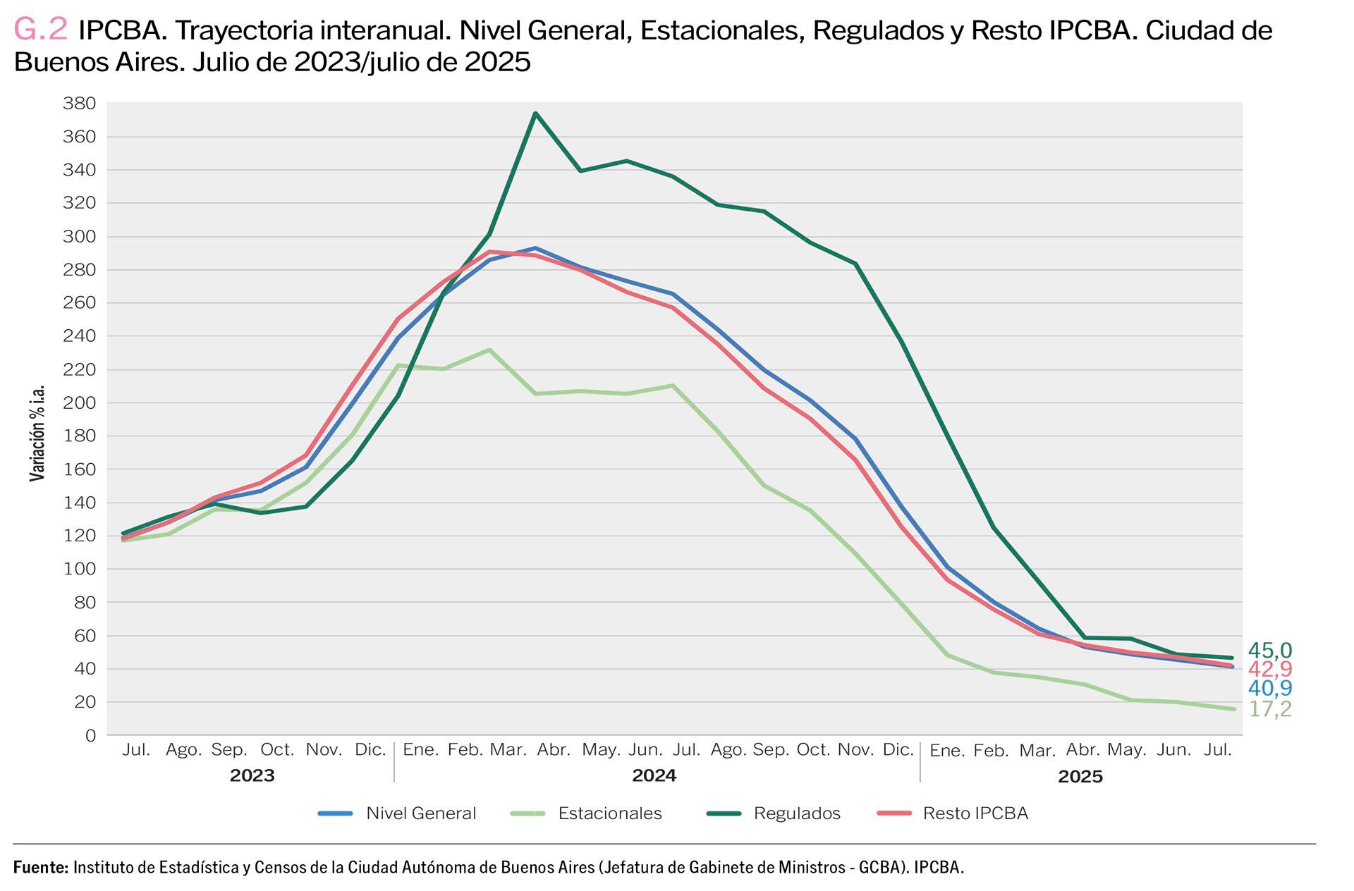 El Índice de Precios al Consumidor de la Ciudad de Buenos Aires (IPCBA) registró en julio un aumento de 2,5%, lo que marcó una aceleración respecto de la cifra registrada el mes anterior (2,1%), informó este jueves el instituto estadístico porteño. Con este último ajuste, la suma acumulada en los primeros siete meses del año alcanzó el 18,1%, mientras que en la comparación interanual, la variación experimentó una desaceleración, al ubicarse en 40,9%, es decir, 3,6 puntos porcentuales por debajo del nivel de junio.