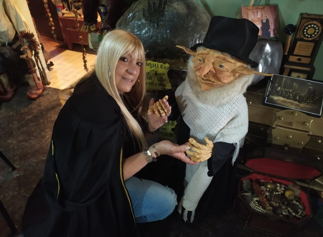 Liliana Chelli junto a uno de sus duendes en su