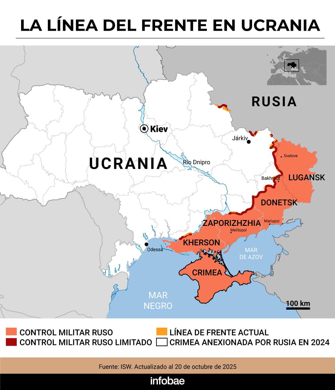 Rusia controla actualmente alrededor de una quinta parte del territorio ucraniano, principalmente en el este y sur del país. Las fuerzas rusas ocupan gran parte de las regiones de Luhansk y Donetsk —conocidas colectivamente como el Donbás— así como porciones significativas de las regiones de Zaporizhzhia y Kherson. Moscú también mantiene el control de Crimea, que anexó en 2014.