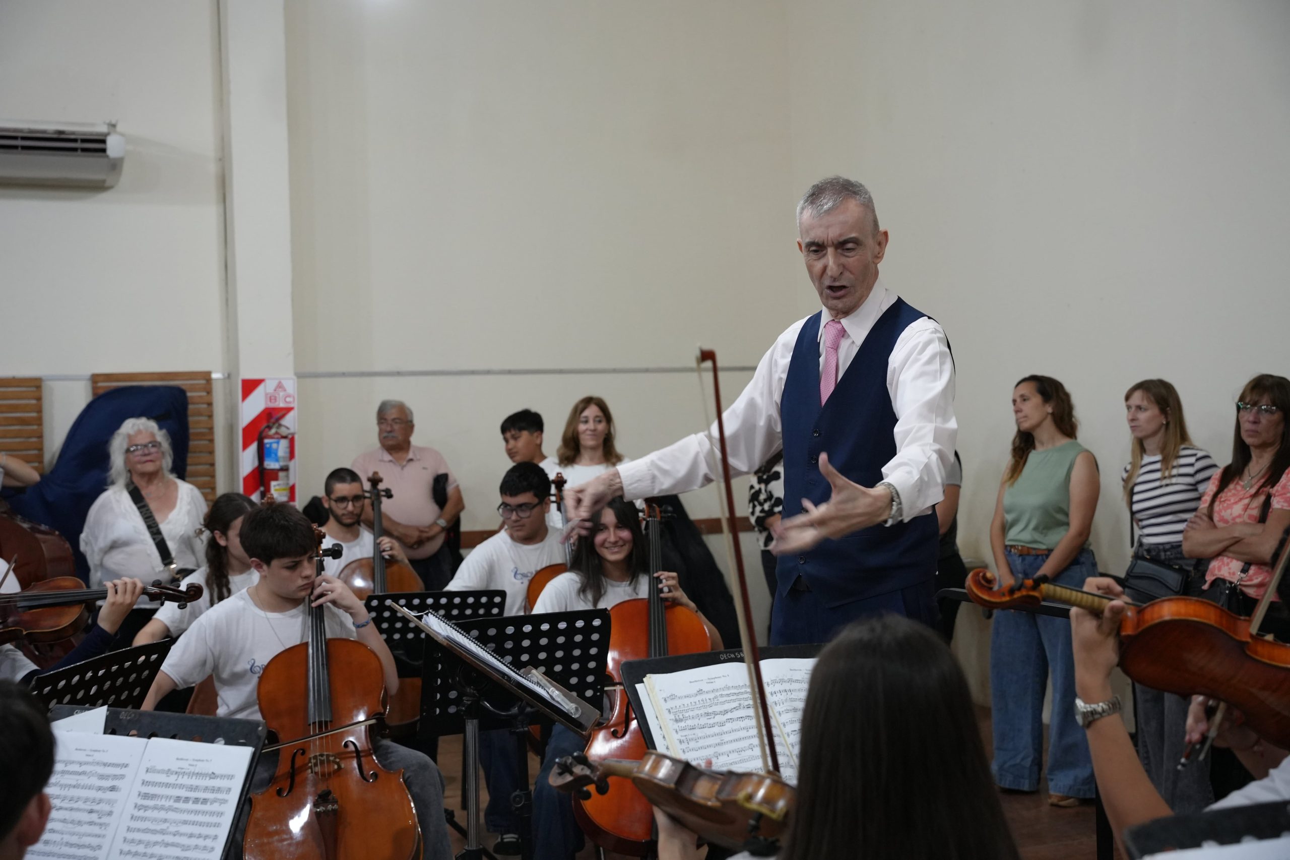 Durante la jornada, el conductor de Telenoche asumió el rol de director invitado y condujo a jóvenes músicos de entre 14 y 19 años en una interpretación que culminó con una ovación del público. Al finalizar, el periodista saludó y felicitó personalmente a cada integrante de la orquesta, en un gesto que reflejó el intercambio generacional y el reconocimiento al esfuerzo colectivo.