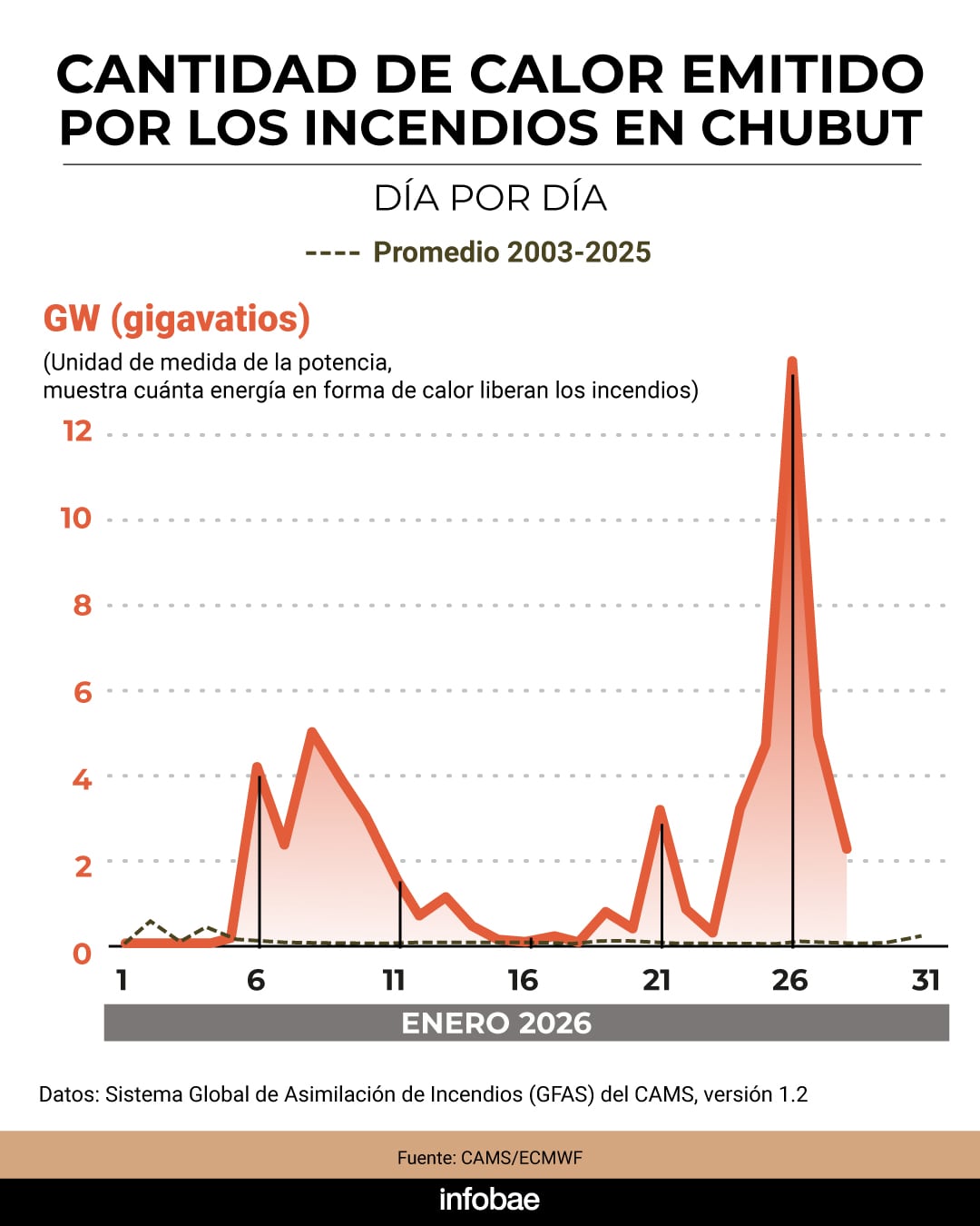 Los incendios forestales en la provincia de Chubut, en la Argentina, alcanzaron niveles sin precedentes en enero de 2026, según datos del sistema de monitoreo ambiental de la Unión Europea.