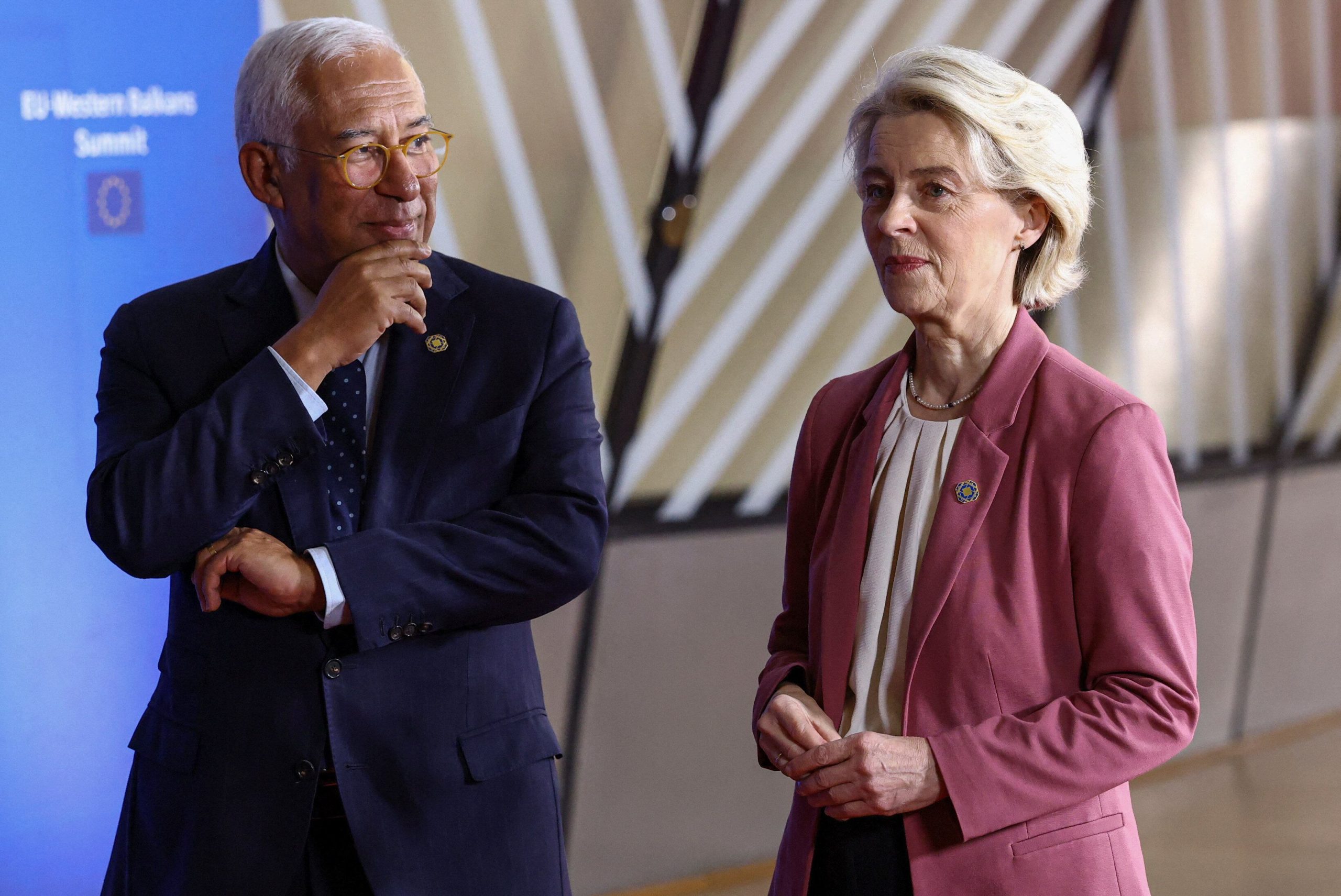La presidenta de la Comisión Europea, Ursula von der Leyen, y el presidente del Consejo Europeo, Antonio Costa, esperan a los invitados en una cumbre de la Unión Europea (REUTERS/Yves Herman/Archivo)