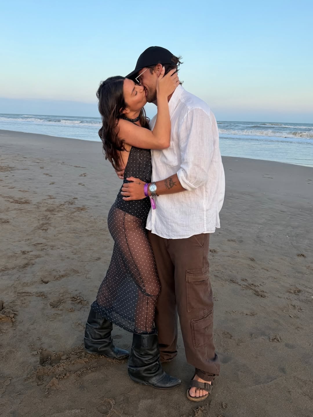 Otra foto la muestra junto a su novio en la playa: ella posa con la misma vestimenta y una sonrisa amplia, mientras él —con camisa blanca, pantalón marrón, sandalias y gorra oscura— la acompaña con una actitud distendida y cercana. La pareja mira a cámara, transmitiendo complicidad y alegría en medio del entorno natural. En una tercera imagen, ambos se funden en un beso y un abrazo, dejando ver la intimidad y el cariño que los une.