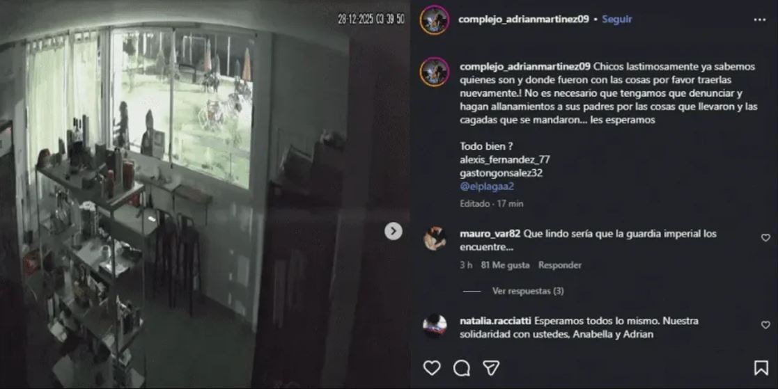 La publicación con el pedido de devolución y la advertencia de que los responsables fueron plenamente identificados —no solo por las cámaras del complejo, sino también por grabaciones de las calles aledañas— se viralizó rápidamente y generó múltiples reacciones en redes sociales. Mientras tanto, desde la cuenta @complejo_adrianmartinez09 se compartieron registros visuales clave del salto a la cocina y del desplazamiento de los autores por el predio, replicando el mensaje de fondo: “Los esperamos”.