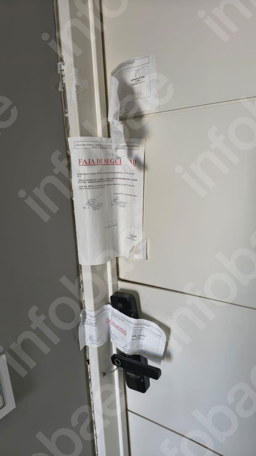 La puerta del semipiso en el último piso del Live aún tiene restos de las fajas de clausura que colocó la Justicia luego de realizar un allanamiento. Como cuando se concretaron los operativos hubo que ingresar a la fuerza, la puerta se sostiene con un alambre. Nadie vive en ellos. Los vecinos no se atreven a acercarse.