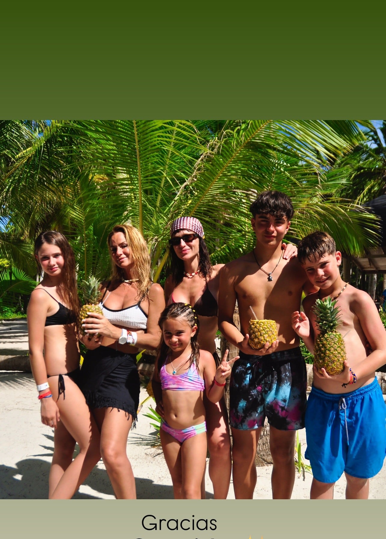El registro fotográfico del viaje compuso una postal espontánea y variada del grupo en pleno disfrute. En una de las imágenes más representativas, todos posan sobre la arena clara de una playa rodeada de palmeras y un mar turquesa que se funde con el horizonte. Con trajes de baño y ananás frescos en mano, los rostros alternan sonrisas plenas y gestos relajados, reflejando la comodidad que brinda la sombra suave de los árboles y el calor del sol caribeño. La luz resalta las pieles bronceadas y genera esa atmósfera alegre propia de unas vacaciones soñadas.