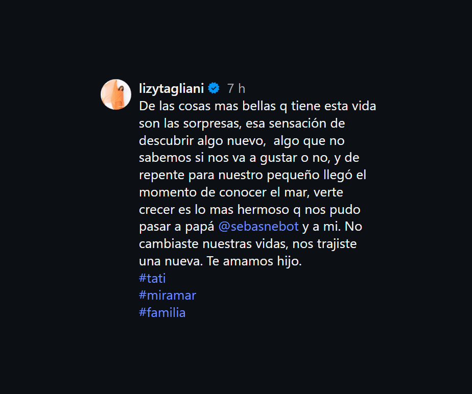 Junto al video, Tagliani publicó un mensaje donde reflexionó sobre el significado de los primeros descubrimientos en el crecimiento familiar. “De las cosas más bellas que tiene esta vida son las sorpresas, esa sensación de descubrir algo nuevo, algo que no sabemos si nos va a gustar o no, y de repente para nuestro pequeño llegó el momento de conocer el mar”, escribió la conductora. Además, subrayó la importancia del momento vivido con su hijo: “Verte crecer es lo más hermoso que nos pudo pasar a papá y a mí. No cambiaste nuestras vidas, nos trajiste una nueva. Te amamos hijo”.