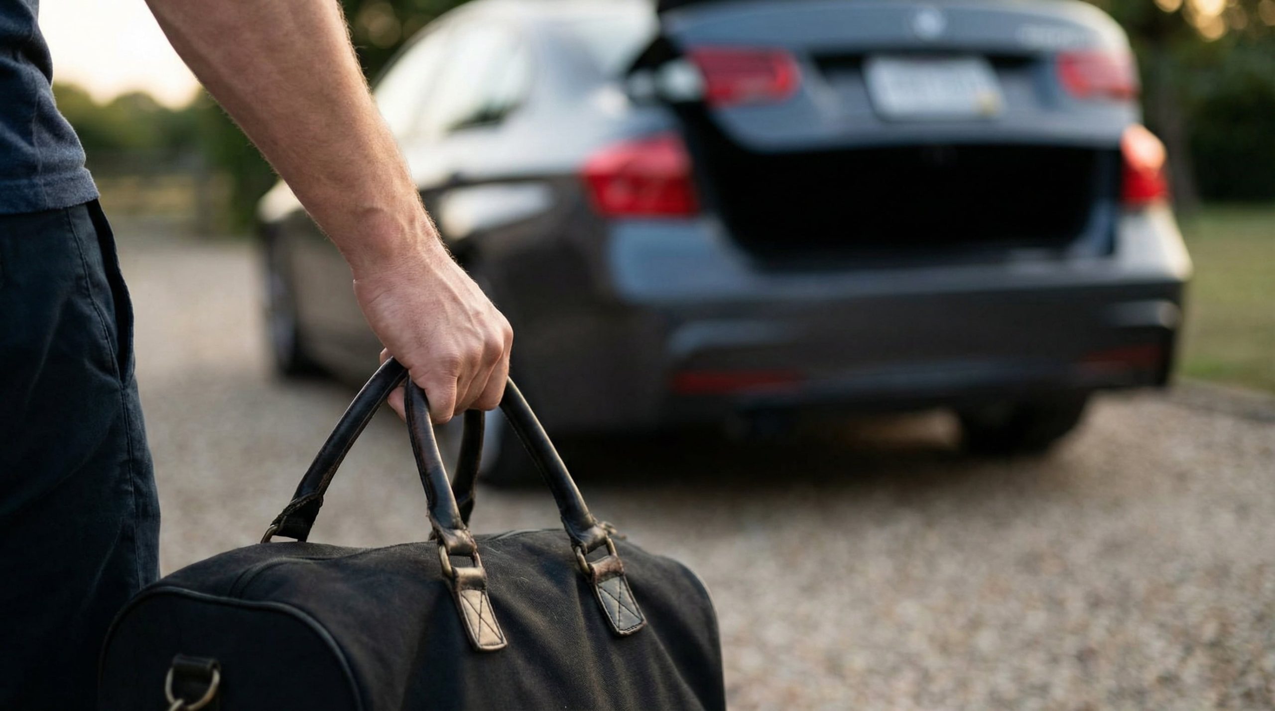 Una persona carga un bolso de viaje negro en el maletero de un coche, preparándose para una escapada o regreso a casa. (Imagen Ilustrativa Infobae)