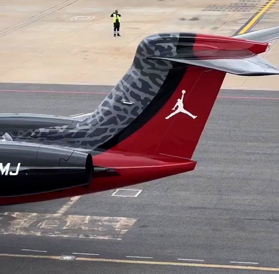 Uno de los aspectos más llamativos del avión de Jordan es su diseño exterior personalizado. La matrícula N236MJ no es casual: el “23” corresponde al icónico número de camiseta que utilizó durante su carrera, el “6” representa sus campeonatos de la NBA y “MJ” son sus iniciales. El trabajo de pintura, que supuso un coste adicional de USD 500.000, cubre la mayor parte del fuselaje con un patrón “elephant print”. Este diseño se extiende a las alas y la cola, donde una franja negra separa los distintos motivos y el característico logotipo “Jumpman” aparece destacado en la sección roja trasera. Los motores, pintados de negro, exhiben la matrícula personalizada, y las ventanillas ovaladas —doce de las dieciséis— están enmarcadas en rojo, aportando un toque distintivo al conjunto.