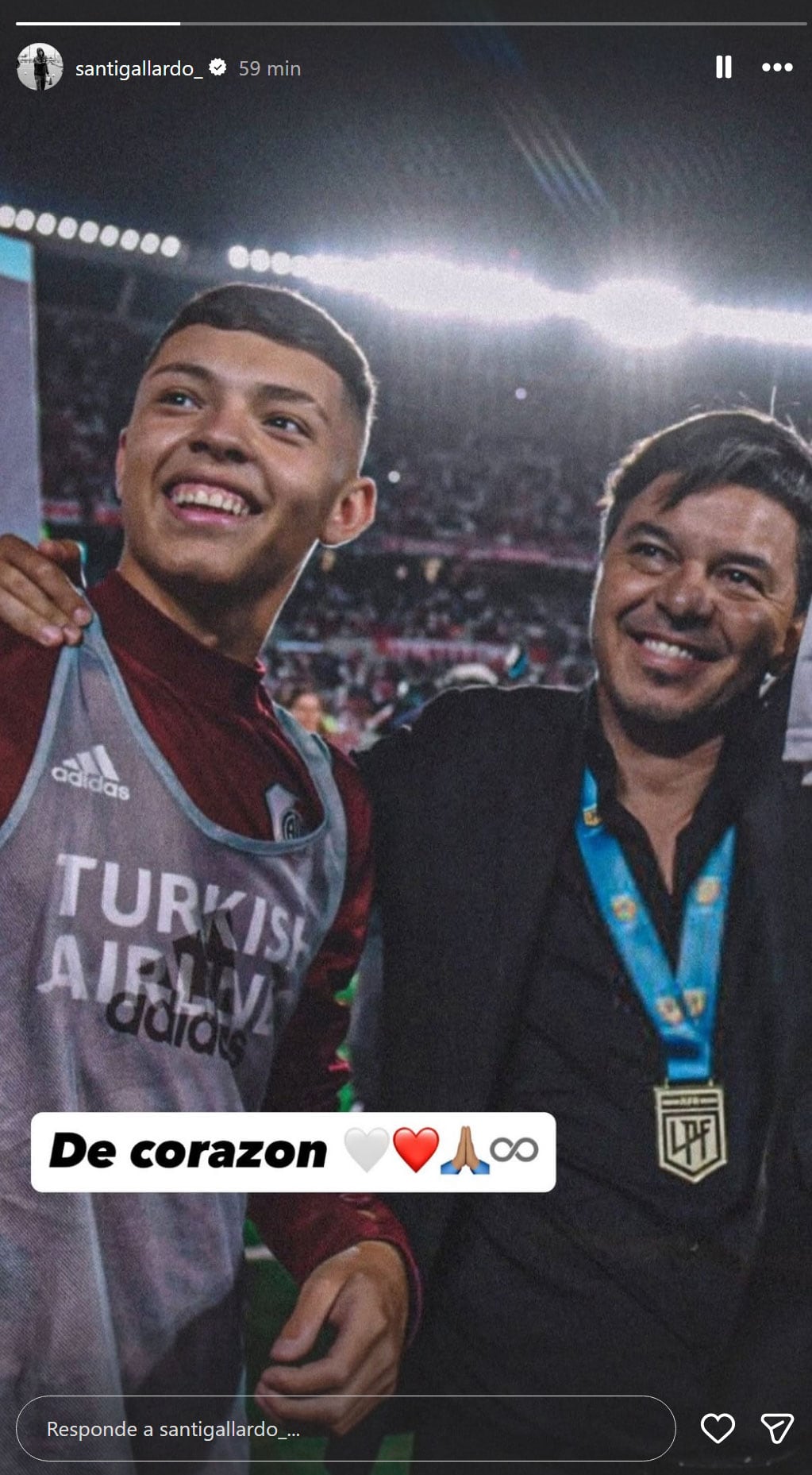 Nahuel Gallardo, hijo mayor del entrenador y futbolista de San Martín de Tucumán, escribió en sus redes sociales: “Quién sabe el amor profundo que sentís por ese escudo y tu gente, el más grande lejos”. El posteo estuvo acompañado por una imagen de Marcelo Gallardo ovacionado en el Monumental, y otra con el emoji de infinito, símbolo de una conexión que, según su familia, trasciende los ciclos deportivos. Santino Gallardo, delantero de Seattle Sounders FC, también compartió una fotografía junto a su padre con la frase “De corazón” y el mismo emoji, en sintonía con el mensaje de su hermano.