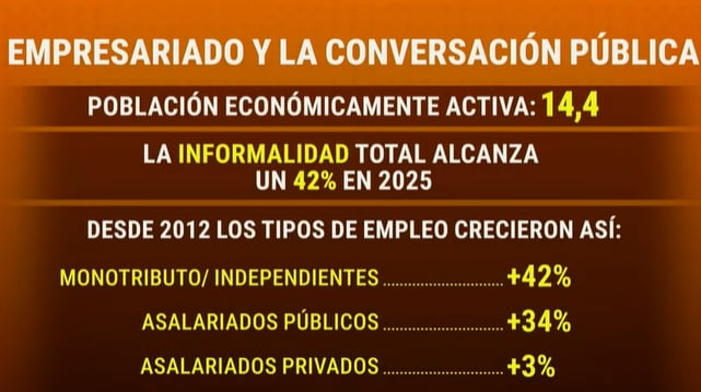 En este sentido, mencionó que el Estado absorbió buena parte del déficit de empleo privado a través del crecimiento del empleo público y de esquemas de monotributo o “subsidios encubiertos a la pobreza”. “El Estado es cómplice de la informalidad, utiliza el monotributo para no aportar y mina su propia capacidad de financiamiento futuro”, afirmó.