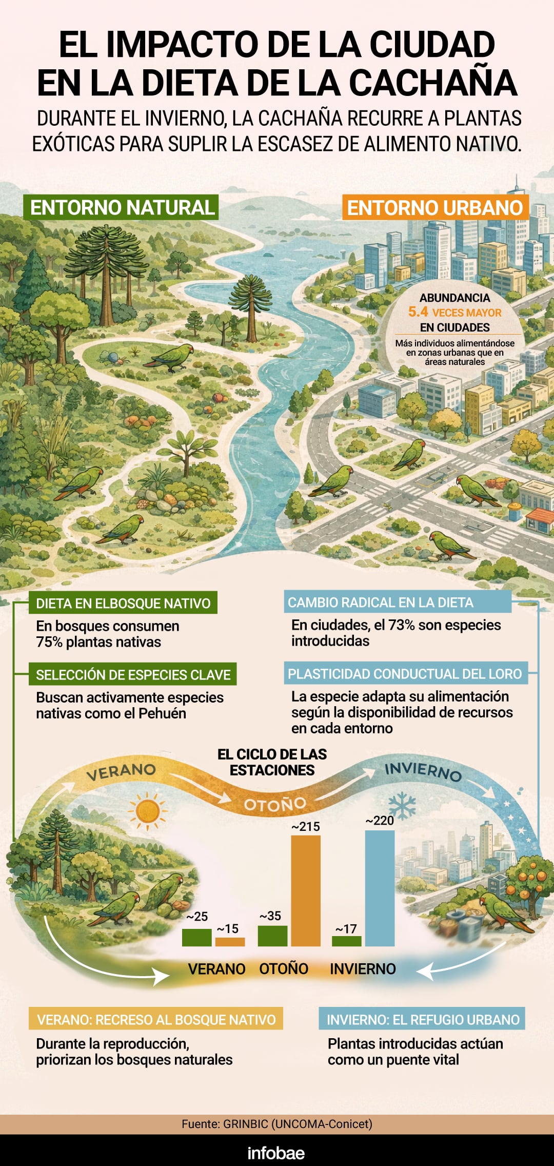 “Cuando decimos todos, nos referimos a los seres humanos y a la naturaleza no humana. Nuestros resultados muestran que las cachañas usan mucho las plantas introducidas en invierno porque en esa época casi no hay frutos ni semillas nativas disponibles. Eso nos dice que las ciudades pueden cumplir un rol importante como refugio estacional”, explicó la doctora en biología Karina Speziale.